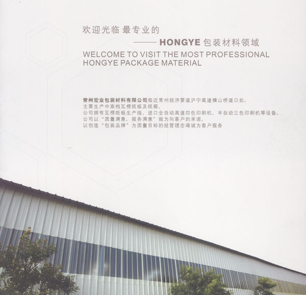 常州宏業(yè)包裝材料有限公司從最初的鮮為人知發(fā)展到現(xiàn)今包裝材料行業(yè)的主流品牌之一。公司生產(chǎn)的包裝材料產(chǎn)品不僅在國(guó)內(nèi)已經(jīng)建立了大量的穩(wěn)定的客戶,產(chǎn)品也已遠(yuǎn)銷到國(guó)外多個(gè)國(guó)家和地區(qū),深受客戶的好評(píng)。 公司臨近常州經(jīng)濟(jì)要道滬寧高速橫山道口處,主要生產(chǎn)中高檔瓦楞紙板及紙箱,公司擁有瓦楞紙板生產(chǎn)線、進(jìn)口全自動(dòng)高速四色印刷機(jī)、半自動(dòng)三色印刷機(jī)等設(shè)備,公司以“質(zhì)量滿意,服務(wù)滿意”做為向客戶的承諾,以創(chuàng)造“包裝品牌”為質(zhì)量目標(biāo)的經(jīng)營(yíng)理念竭誠(chéng)為客戶服務(wù)。 公司已通過ISO9001和1400的認(rèn)證。 宏業(yè)包裝的商業(yè)信條:宏業(yè)相信自己會(huì)成功, 宏業(yè)相信自己所銷售的商品 ,宏業(yè)員工相信自己所在的公司 ,宏業(yè)相信自己的員工和客戶,宏業(yè)相信成功并不是賺取金錢,而是創(chuàng)造信譽(yù),只有好的信譽(yù),成功才會(huì)有價(jià)值,宏業(yè)相信世界上最美好最偉大的詞就是“自信”,宏業(yè)相信自已每做一次銷售,就交上一個(gè)朋友。