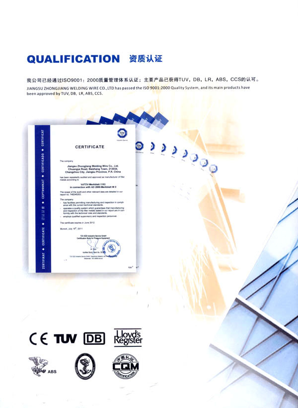 江蘇中江焊絲有限公司成立于1989年,注冊(cè)資金2188萬(wàn)元,是一家專業(yè)從事氣體保護(hù)鍍銅焊絲、鋁焊絲、藥芯焊絲和埋弧焊絲的生產(chǎn)企業(yè)。 經(jīng)過(guò)近20年的不懈努力,目前企業(yè)年生產(chǎn)各類焊絲達(dá)50000余噸,產(chǎn)品不僅銷往全國(guó)各省市和地區(qū),還出口到美國(guó)、意大利、英國(guó)、法國(guó)、西班牙、波蘭、捷克、斯洛伐克、立陶宛、斯洛文尼亞、俄羅斯、烏克蘭、希臘、以色列、伊朗、南非、泰國(guó)、印尼、印度、澳大利亞等三十幾個(gè)國(guó)家和地區(qū)。 江蘇中江焊絲有限公司是通過(guò)IS09001:2000質(zhì)量管理體系認(rèn)證的企業(yè),其主要產(chǎn)品已獲得TUV,DB,LR,ABS,CCS的認(rèn)可。企業(yè)奉行“一流的產(chǎn)品,一流的信譽(yù),一流的服務(wù)”的宗旨,竭誠(chéng)為客戶服務(wù)。