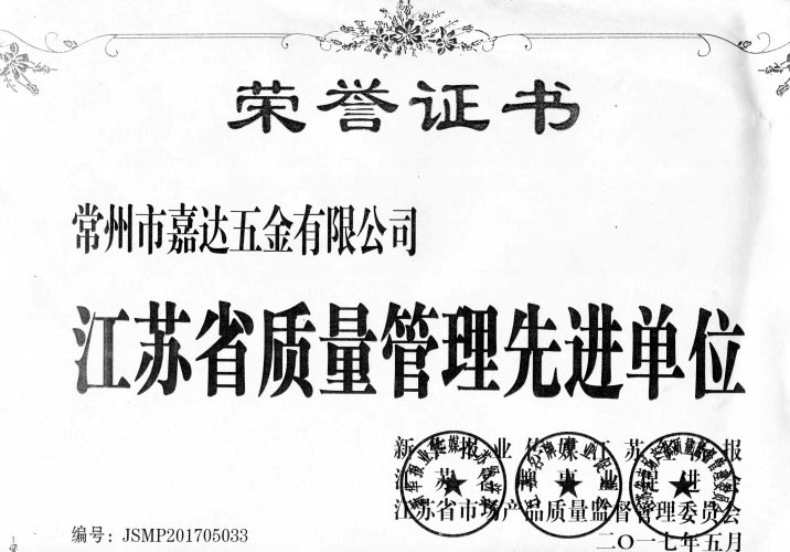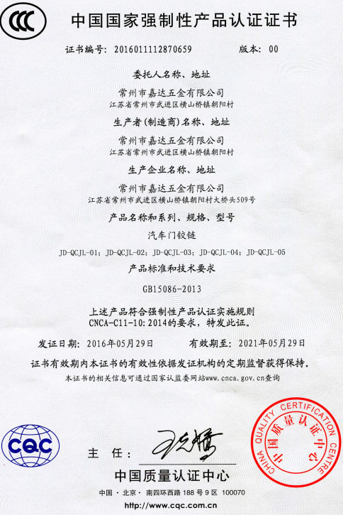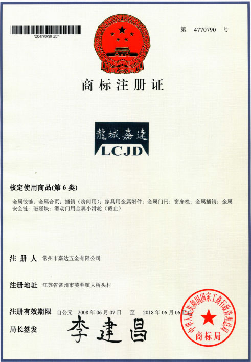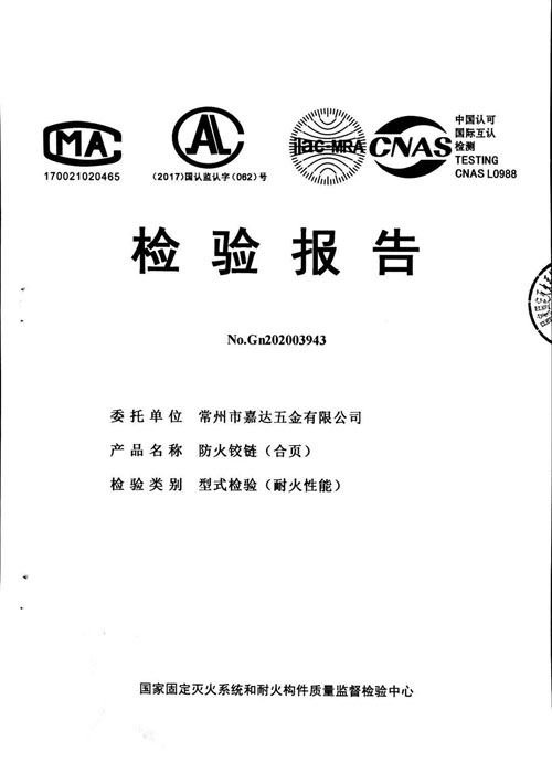 常州市嘉達五金有限公司是專業(yè)生產(chǎn)不銹鋼防火、防盜合頁、銅手拉門、銅門鉸鏈、銅花和各種不銹鋼暗插銷的企業(yè).最近又成功開發(fā)承重鉸鏈以及調節(jié)門縫可調式鉸鏈.同時引進澳大利亞技術開發(fā)各種鋁合金透氣百頁窗,遠銷歐美市場. 我司占地面積25000平方米,建筑面積12000平方米;固定資產(chǎn)1200萬元,公司設備齊全,設計獨特,檢測一流,產(chǎn)品適用于高級防火門以及現(xiàn)代高層居室、艦船門的配套,也適應于一般居民.產(chǎn)品經(jīng)"天津國家固定滅火系列和耐火構件質量監(jiān)督檢驗中心"檢驗合格. 公司重視產(chǎn)品質量,重視產(chǎn)品開發(fā)創(chuàng)新.目前已建立完整的質量管理體系:通過ISO9001:2000質量認證體系和中國強制認證3C認證.產(chǎn)品曾獲國家知識產(chǎn)權局"中國專利技術博覽會"金獎、獲得"企業(yè)資信等級AAA級"、"信用(合同)AAA級企業(yè)"、"中國檢驗協(xié)會會員"、"中國電器照明協(xié)會委員"、"中國工商協(xié)會委員"、"首批國家質量服務信得過單位"、"常州市文明單位"及"武進區(qū)文明單位"的稱號. 公司的經(jīng)營宗旨是"以顧客為中心、以質量為市場、以創(chuàng)新求發(fā)展、以管理求效益". 公司將一如既往,以一流的產(chǎn)品質量,誠心周到的服務使顧客滿意,以更好的服務于客戶.