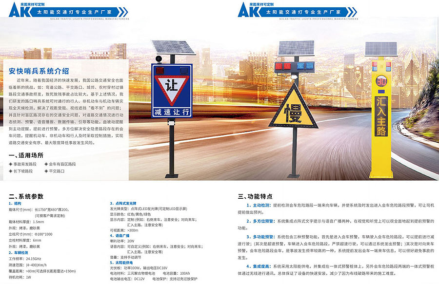 常州安快交通設(shè)施有限公司成立于2018年,位于江蘇省常州市鄒區(qū)鎮(zhèn)。是一家專業(yè)生產(chǎn)銷售交通信號電子產(chǎn)品廠家。主要產(chǎn)品有:太陽能爆閃燈、回轉(zhuǎn)燈、雷達測試儀、黃慢燈警示燈、假警車、保通機器人、移動紅綠燈、道路智能化預警系統(tǒng)的廠家。本公司真誠的希望與客戶在臺作中加深了解、促進友誼并期待與其建立長遠良好平等互利的臺作伙伴關(guān)系。我們竭誠歡迎各界朋友來公司蒞臨指導、洽談業(yè)務井提出寶貴意見。