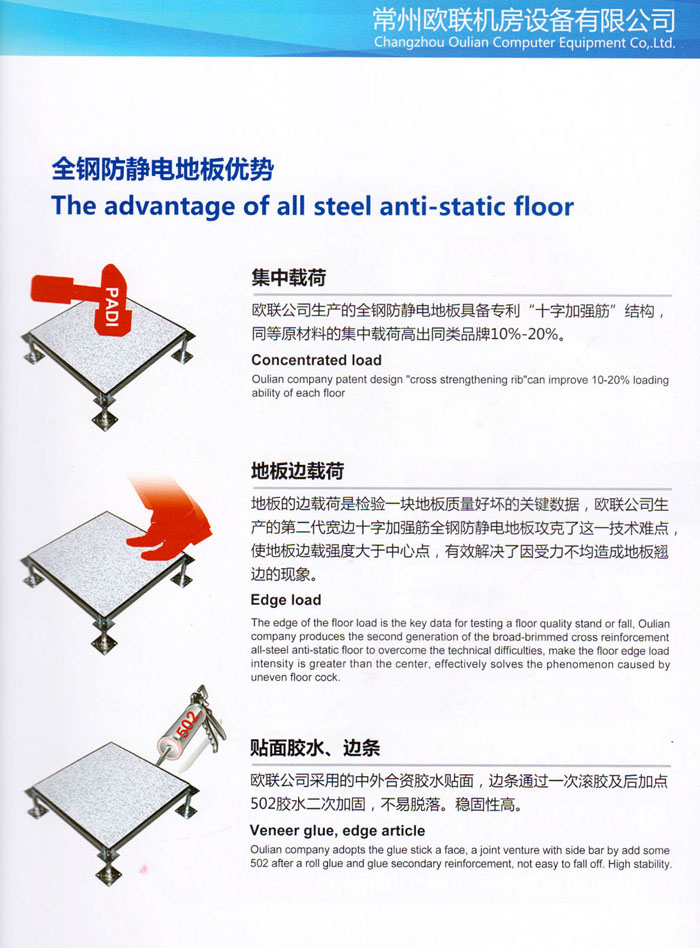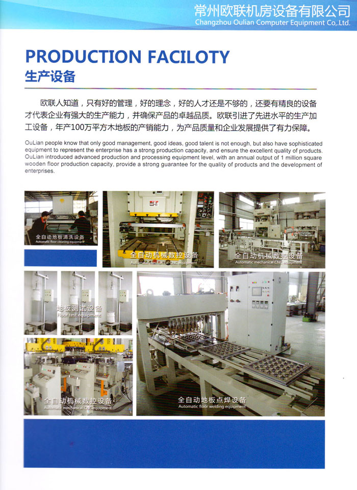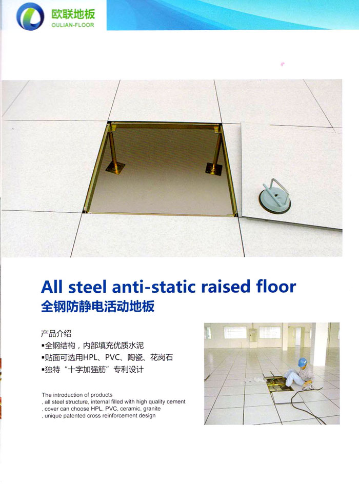 防靜電高架活動(dòng)地板、全鋼地板、陶瓷地板是計(jì)算機(jī)行業(yè)發(fā)展起來的新型鋪地材料,隔離了潮氣、靜電灰塵,最重要的是解決了綜合布線問題,無需預(yù)埋管線,可隨時(shí)拆卸、搬移,保證了資訊設(shè)備完整的優(yōu)點(diǎn),適應(yīng)了智能化樓宇中信息自動(dòng)化技術(shù)對(duì)所處環(huán)境的特定要求,避免了廣大客戶的雙重投資,使現(xiàn)代化辦公程度更加高效,辦公場(chǎng)所更加舒適。 “歐聯(lián)”系列全鋼地板,符合國(guó)家安全要求,種類完備多樣,其中防靜電陶瓷地板、硫酸鈣地板等除具有普通瓷質(zhì)的裝飾和實(shí)用性外,其耐磨、防水、防火功能優(yōu)于其它同類產(chǎn)品,防靜電系列地板,能切合不同客戶的要求,其靈活的配置,深受客戶歡迎,不同材質(zhì)的地板結(jié)構(gòu)使設(shè)計(jì)師的設(shè)計(jì)空間比傳統(tǒng)的更加廣闊自由和善變。 公司大力發(fā)展國(guó)內(nèi)外銷售業(yè)務(wù),多次中標(biāo)國(guó)內(nèi)重點(diǎn)工程 ,例:哈爾濱醫(yī)科大學(xué)、山東大學(xué)、上海普通機(jī)場(chǎng)等。 公司將一如既往開發(fā)和制造一流的產(chǎn)品,愿與廣大有識(shí)之士合作發(fā)展,共創(chuàng)美好未來。