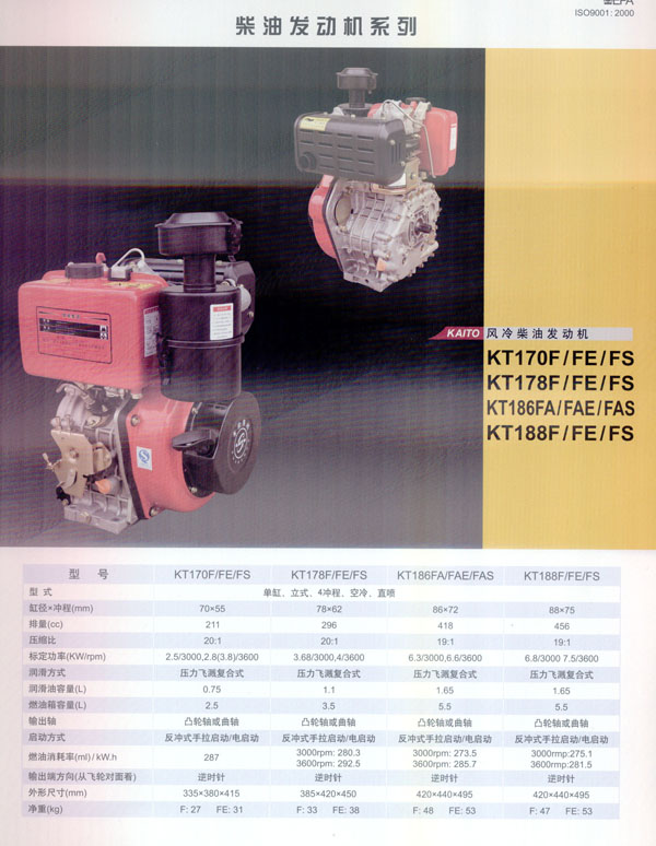 常州常柴集團(tuán)凱拓電動機(jī)械有限公司是常柴集團(tuán)所屬,集自主研發(fā)設(shè)計(jì)及生產(chǎn)的出口型產(chǎn)業(yè)基地! 〕2窦瘓F(tuán)是一家擁有近一萬名在職員工的國有大型企業(yè),年均產(chǎn)值近三億美元,平均出口總額近八千萬美元,同時也是中國內(nèi)地五百強(qiáng)企業(yè)之一。 常柴集團(tuán)凱拓電動機(jī)械有限公司的主要產(chǎn)品流水線基于日本YAMMAR型超級風(fēng)冷柴油發(fā)動機(jī),以及其配套發(fā)電機(jī)組,水泵機(jī)組和數(shù)碼變頻發(fā)電機(jī),我司目前擁有常柴集團(tuán)及凱拓品牌的知名商標(biāo)使用權(quán),旗下所有分廠如機(jī)械加工廠、鑄造廠以及發(fā)動機(jī)廠等生產(chǎn)基地都通過了ISO9001-2000質(zhì)量管理體系認(rèn)證。我司自主品牌凱拓柴油發(fā)電機(jī)組KT5000SE,KT5000LE,數(shù)碼變頻發(fā)電機(jī)KT1000Ti以及柴油發(fā)動機(jī)186F均通過德國TUV公司的CE認(rèn)證,美洲EPA認(rèn)證,因此出口量很大,近年來公司產(chǎn)品已遠(yuǎn)銷美洲、歐洲、非洲以及東南亞國家和地區(qū)。 依托常柴集團(tuán)的領(lǐng)先技術(shù),強(qiáng)有力的管理體制,以及健全的產(chǎn)品質(zhì)量體系,我司通過不斷優(yōu)化自主設(shè)計(jì)研發(fā),完善管理機(jī)制,期望能夠以提供最優(yōu)質(zhì)的產(chǎn)品售后服務(wù)進(jìn)一步拓展國際市場! ”局皥F(tuán)結(jié)、合作、奮斗”的公司理念,我們希望著眼全球,與更多潛在的客戶開展合作交流,最終實(shí)現(xiàn)雙贏的戰(zhàn)略目標(biāo)。