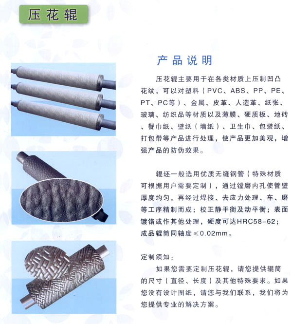 常州市武進區(qū)禮嘉鎮(zhèn)萬超機械有限公司專業(yè)生產(chǎn)、加工花輥、鏡面輥、無紡布設備,及各類機械配件。產(chǎn)品廣泛應用于金屬、塑料、皮革、紙張、玻璃、木材、無紡布、衛(wèi)生材料、包裝裝潢等行業(yè)。 公司經(jīng)營方針:服務鍥而不舍 品質力臻卓越。得到國內眾多客戶的厚愛與好評。 歡迎各界朋友蒞臨常州萬超機械有限公司指導和業(yè)務洽談。 萬超為顧客免費打樣、并代客壓紋!