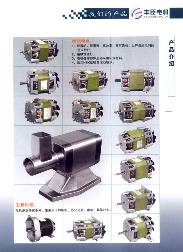 本公司在發(fā)揮傳統(tǒng)技術優(yōu)勢的基礎上,積極開展多方位的技術合作,協(xié)同常州市津盛辦公用品有限公司開發(fā)感應電機產(chǎn)品市場。公司引進國際上先進的全自動浸漆生產(chǎn)線,產(chǎn)品生產(chǎn)自動化程度高,產(chǎn)品質量穩(wěn)定可靠。電機表面有噴漆、涂塑等防腐處理,產(chǎn)品具美觀、耐腐蝕、安裝簡便等優(yōu)點,廣泛應用于辦公設備用品、電動工具等行業(yè)。