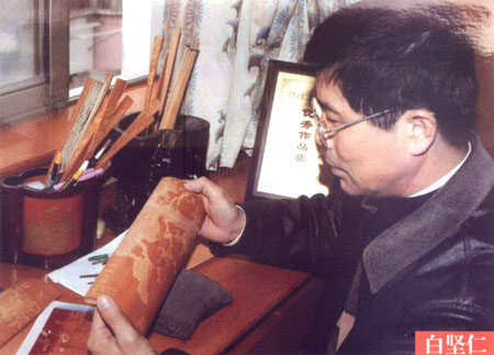 白堅仁,1956年生于江蘇常州,國家級非物質文化遺產、江蘇省級傳承人、江蘇省名人,高級工藝美術師,是留青竹刻泰斗白士風之子。從小深受先父的熏陶和指點,寒來署往、夜以繼日,不僅學到了先父厚樸豁達的品格,更深得先父竹刻藝術的真諦。除繼承刻有先父創(chuàng)立的橫臺屏、筆筒等作品外,更注重作品的創(chuàng)新。多年來,經過艱辛的探索和反復的實踐,努力吸取姐妹藝術,成功地采用了多片拼裝,配上紅木框架,制成大型的圖文并貌的作品,如帽籠、大插屏、鏡框掛件、四條屏、甚至中堂。在構圖內容、技法變化、裝幀形式等方面,都走出了創(chuàng)新之路,使所制作品適應了現代人們的審美情趣和生活需求,實現了多年來要使留青竹刻與書畫作品同樣也能懸掛于廳堂之上的愿望。作品多次在國內、國際展覽中獲獎,并獲得了留青竹刻史上的首位二項國家專利擁有者。