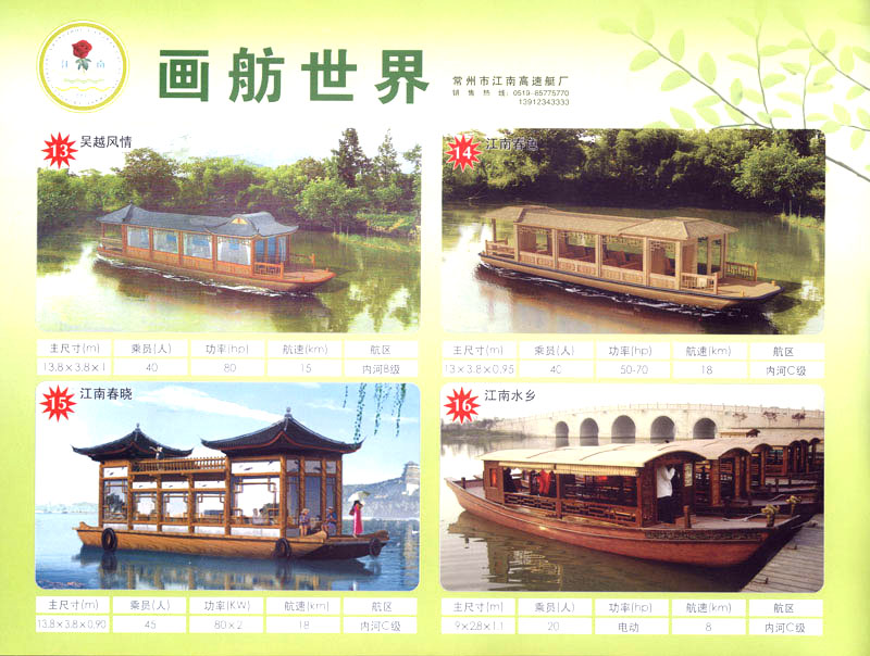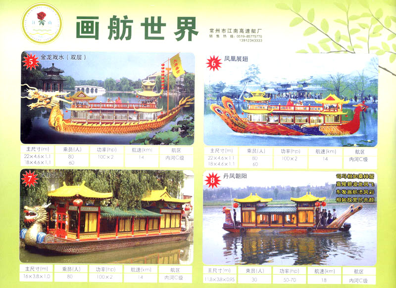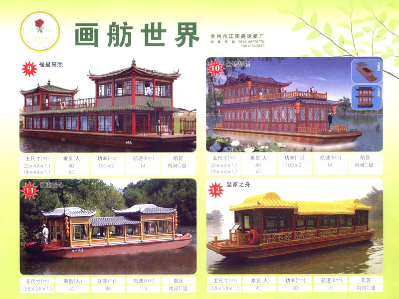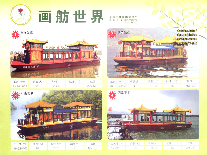 隨著人民生活的提高和水上旅游業(yè)的不斷發(fā)展,原有的游艇已遠不能滿足人民群眾不斷提高的需求。為適應(yīng)水上旅游業(yè)市場的變 化,我廠開發(fā)研制了符合中國國情、具有民族特色的仿古畫舫游艇及國際最新流行款式一城市旅游休閑觀光艇。特別近兩年又開發(fā)了一批精品畫舫船投放市場之后深受景區(qū)的歡迎。今年我廠又開發(fā)了適用少數(shù)民族的“風(fēng)雨橋”、“寨門”畫舫艇。在湖南、廣西、云南、貴州深受愛戴。此艇別具風(fēng)格,民族風(fēng)情特別濃厚。侗鄉(xiāng)一號計劃在2006年5月1日投放在貴州黎平侗鄉(xiāng)風(fēng)景區(qū)八舟河景區(qū)使有(風(fēng)序號)。我廠歡迎用戶來圖加工,來廠考察訂貨,畫舫艇款式多多,終有一款適合你。歡迎來電來函垂詢。索樣即寄。誠心銷售、人情化服務(wù)、企業(yè)文化、精品畫舫。