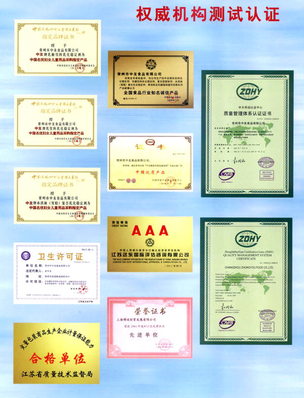 常州市中友食品有限公司;匚挥诔V菔袞|郊開發(fā)區(qū),廠房占地面積6000平方米,擁有全新的生產(chǎn)線,先進(jìn)的生產(chǎn)流程和嚴(yán)格的質(zhì)量管理體系(工廠已通過IS09001:2000質(zhì)量管理體系的認(rèn)證)。并有專業(yè)的技術(shù)開發(fā)和理化檢驗(yàn)的設(shè)施、經(jīng)驗(yàn)豐富的技術(shù)人員。公司以科技為依托,常年與高等院校合作,不斷地開發(fā)和研制適合市場需求的食品添加劑系列產(chǎn)品。公司每年面向全國招收優(yōu)秀的博士、碩士及優(yōu)秀的大學(xué)生。公司現(xiàn)有員工1 00多人,管理人員2 0名、高工5名、產(chǎn)品專業(yè)技術(shù)開發(fā)人員12名,還有選擇地引進(jìn)和代理國內(nèi)外各種適用的食品添加劑。 依靠本公司雄厚的科技力量和先進(jìn)的科技設(shè)備,生產(chǎn)基地已經(jīng)具備了與客戶共同開發(fā)國內(nèi)外先進(jìn)食品添加劑的應(yīng)用技術(shù)。博適中友公司多年來致力于食品添加劑的研究和開發(fā),突破常規(guī)理念,以市場、用戶為中心,研究開發(fā)各個品種、各個檔次的食品添加劑,品種齊全又多樣,既有出口型又有內(nèi)銷型。公司主要穩(wěn)定劑產(chǎn)品有:乳飲料乳化穩(wěn)定劑、乳酸飲料乳化穩(wěn)定劑、冰淇淋(雪糕)復(fù)合乳化穩(wěn)定劑、果汁飲料乳化穩(wěn)定劑等,產(chǎn)品暢銷國內(nèi)外,覆蓋了全國二十多個省市,并建立了穩(wěn)定的銷售網(wǎng)絡(luò)。 本公司對產(chǎn)品指定了嚴(yán)格的質(zhì)量標(biāo)準(zhǔn),并報請常州市技術(shù)檢驗(yàn)監(jiān)督局審核批準(zhǔn),其技術(shù)要求完全符合GB一2760(食品添加劑使用衛(wèi)生標(biāo)準(zhǔn))和符合聯(lián)合國直接衛(wèi)生組織(WHO)、聯(lián)合國食品與農(nóng)業(yè)組織(FAO)以及美國食品和藥物管理局的有關(guān)規(guī)定。 長期以來,博適中友公司以市場定位為基本依據(jù),堅持發(fā)展并開辟多元化的國內(nèi)外市場:以專業(yè)化、長遠(yuǎn)化、規(guī);癁榻(jīng)營思路:以開拓創(chuàng)新,務(wù)實(shí)誠信為經(jīng)營理念,不斷促進(jìn)企業(yè)發(fā)展壯大。 公司自創(chuàng)建以來,始終不渝地堅持質(zhì)量第一、信譽(yù)至上,以精湛的工藝加工產(chǎn)品,不管是標(biāo)準(zhǔn)的或特制的都可享有本公司優(yōu)良的技術(shù)服務(wù)。無論您需要何種功能性添加劑,博適中友食品添加劑公司均能滿足您的要求。博適中友公司以價格合理、服務(wù)周到為經(jīng)營宗旨,努力引導(dǎo)食品添加劑應(yīng)用發(fā)展的新潮流、新方向。在才能卓越的領(lǐng)導(dǎo)者的帶領(lǐng)下,全體員工以開拓、創(chuàng)新、求實(shí)、守信為企業(yè)精神,不斷地提高自身的素質(zhì)。 公司的宗旨是“開拓創(chuàng)新發(fā)展、精誠服務(wù)和諧”為目標(biāo),熱忱與各界有識之士攜手共進(jìn),共創(chuàng)輝煌!如今公司業(yè)務(wù)蒸蒸日上,專業(yè)技術(shù)研究越走越精,這都與廣大客戶大力支持分不開。在新世紀(jì)來臨之際,上海博適中友公司愿與您真誠合作,攜手并進(jìn),共鑄新的輝煌!