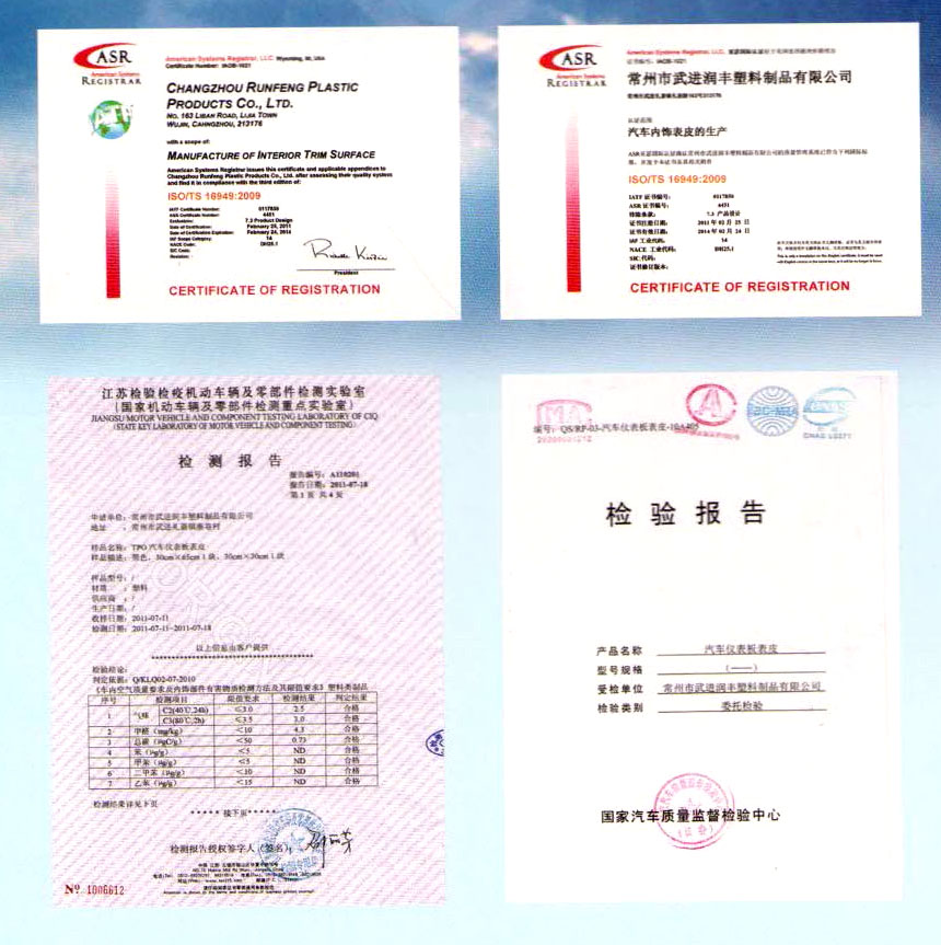 常州市武進潤豐塑料制品有限公司地處風景美麗經(jīng)濟發(fā)達的長江三角洲常州市東郊禮嘉鎮(zhèn),公司占地面積約8000平方米,且地理位置優(yōu)越,是中外客商常涉之地。 本公司專業(yè)生產(chǎn)汽車儀板軟化表皮、PVC門護板表皮、PVC復合制品、壓延薄膜制品,(塑料制品除醫(yī)用塑料制品),車輛零部件,機械電器零部件,電子元件,沖壓件制造,加工無妨制品,玻纖氈(GFP板),麻氈板等。本公司的產(chǎn)品在國內(nèi)一線乘用車上廣泛使用。產(chǎn)品通過國家汽車質量監(jiān)督檢驗中心檢測,并取得了各種證書,如亞瑟國際認證;ISO/TS1694:2009等。 本公司技術力量雄厚,生產(chǎn)設備先進。多年來,建立了較完善的質量管理體系,以先進的檢測技術,優(yōu)質的服務態(tài)度,向客戶提供最優(yōu)秀的產(chǎn)品,在同行中享有良好的聲譽。 歡迎新老客戶來公司指導,洽談,合作。