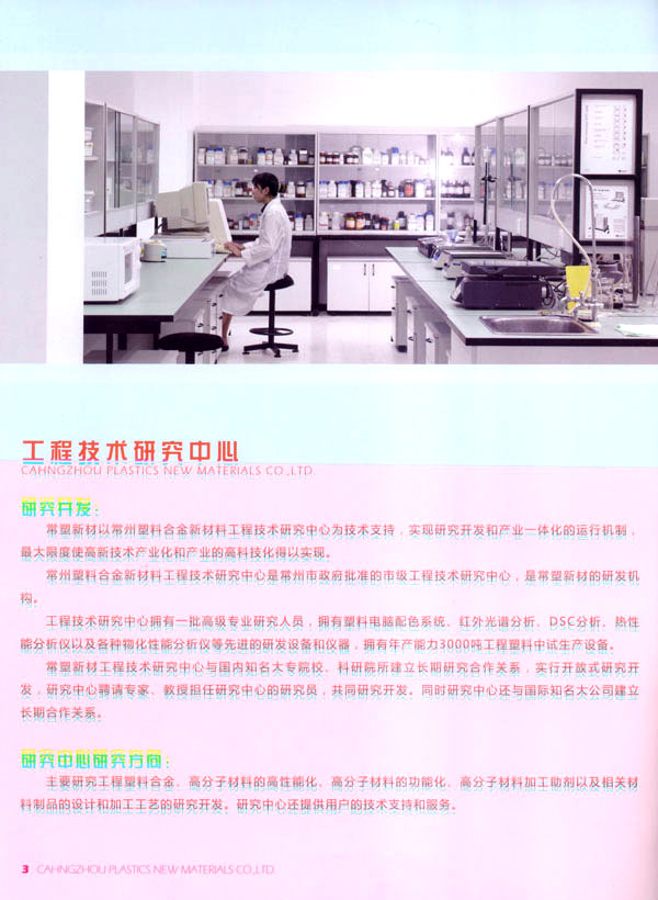 常州常塑新材料有限公司(原名常州塑料集團新材料有限公司)是一家民營股份制企業(yè)。主要從事高分子材料和塑料助劑的研究開發(fā)、生產(chǎn)、銷售、服務。 常塑新材料以常州塑料集團與韓國新湖油化合資建設的10萬噸ABS樹脂為基礎,和與德國吉瑪公司合資建設的20萬噸PET樹脂。以常州塑料集團工程技術研究中心為技術依托,實現(xiàn)科研與產(chǎn)業(yè)一體化的組合模式。 公司建設年產(chǎn)3萬噸工程塑料生產(chǎn)基地,生產(chǎn)各種阻燃ABS、耐熱ABS樹脂、工程塑料合金、功能高分子材料以及塑料助劑等產(chǎn)品。 公司目標:把常塑新材料建設成一流的高分子材料研究開發(fā)、生產(chǎn)、銷售、服務的高科技企業(yè)。 公司理念和價值觀:誠信經(jīng)營、不斷創(chuàng)新、追求卓越、創(chuàng)造價值。 公司旨在創(chuàng)造以人為本不斷創(chuàng)新的企業(yè)可持續(xù)發(fā)展的核心競爭力,為社會創(chuàng)造價值。