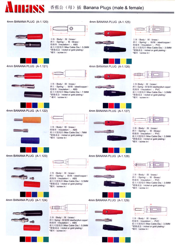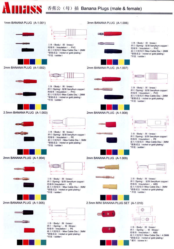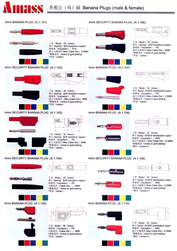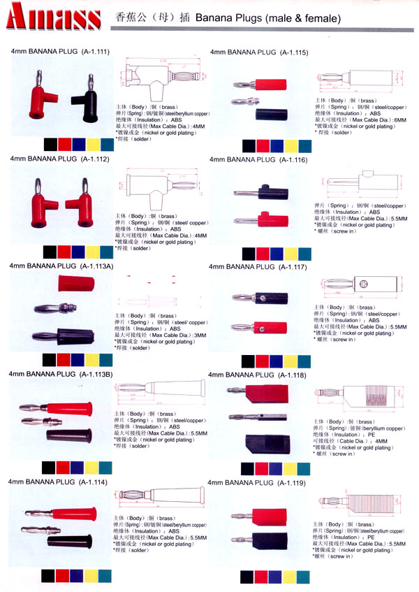 本公司專業(yè)生產(chǎn)各類香蕉插頭,香蕉插座,接線柱,電瓶夾,鱷魚夾,測(cè)試導(dǎo)線,測(cè)試筆等。產(chǎn)品分2mm/2.5mm/3mm/3.5mm/4mm五大系列,百余種款式, 各種香蕉插廣泛用于儀器、儀表、電力測(cè)試、教學(xué)、玩具,視聽設(shè)備、醫(yī)療儀器,保健產(chǎn)品等領(lǐng)域。公司技術(shù)力量雄厚,生產(chǎn)工藝先進(jìn),產(chǎn)品遠(yuǎn)銷港、臺(tái)、歐美,并與飛利浦等國(guó)際品牌配套。公司本著精益求精的理念,歡迎新老客戶光臨。