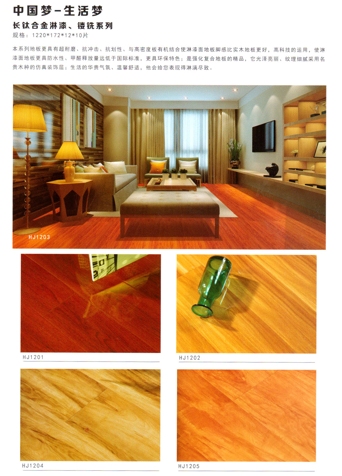 目前我們主要經(jīng)營“惠居”、  “靈盛”牌木質(zhì)強化地板,現(xiàn)在已經(jīng)開發(fā)出水晶面、羽絲面、浮雕面、立體刀砍紋、手抓紋、4v仿實木、金剛淋漆面、模壓面、橡木真木紋、防水系列等多個系列產(chǎn)品,涵蓋了市場上所出現(xiàn)的所有產(chǎn)品系列!