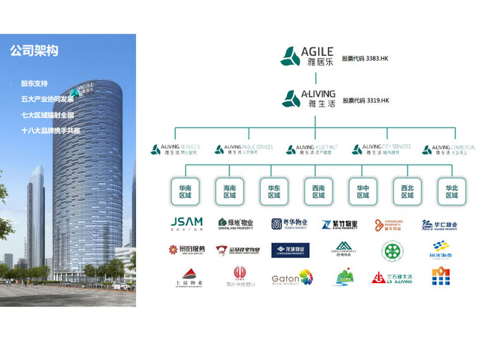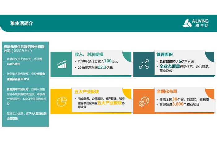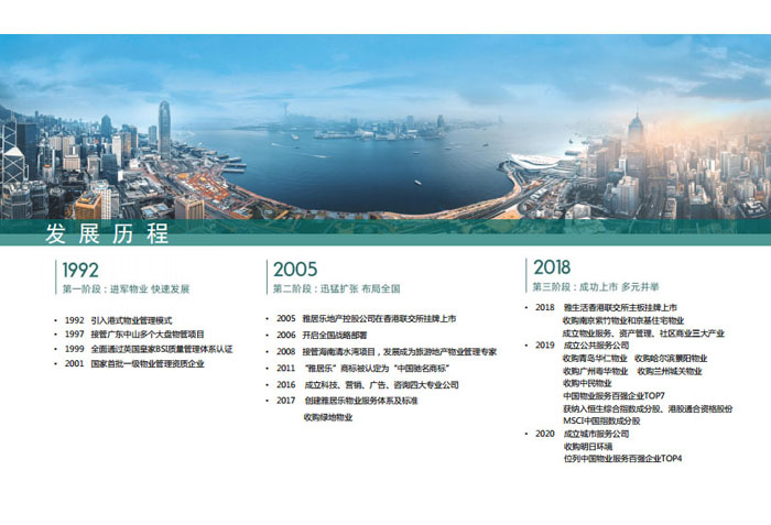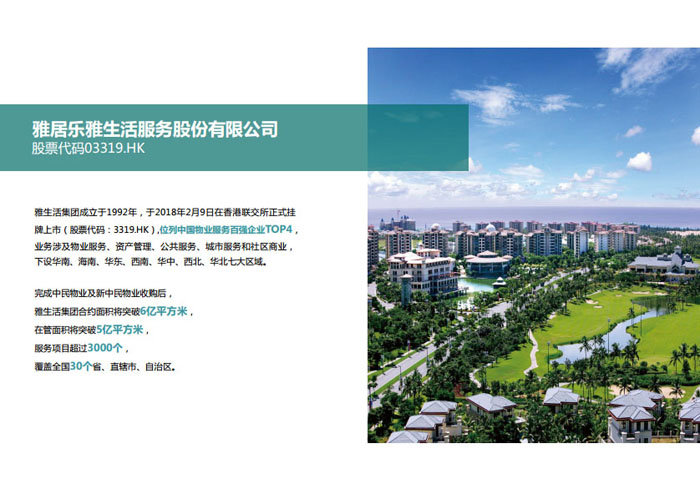 一、立足北上廣,面向全中國,走向全世界 1992年,雅居樂物業(yè)開篇中山,率先引入港式物業(yè)管理模式。1997年,依托雅居樂地產的崛起,連續(xù)接管中山多個項目,成為高端大盤物業(yè)管理的領跑者。1999年,雅居樂物業(yè)開啟專業(yè)化發(fā)展模式,全面通過英國皇家BSI的ISO9000質量管理體系認證,2001年成為國家首批一級物業(yè)管理資質企業(yè)。 2002年,隨著廣州雅居樂花園的盛大啟幕,雅居樂物業(yè)邁開向廣州進軍的步伐。為尋求更長遠的發(fā)展,雅居樂積極構思上市藍圖,2005年在香港成功上市。在深耕珠三角城市群的同時,2006年雅居樂物業(yè)揮師北上,正式開啟全國部署戰(zhàn)略。2008年,接管海南清水灣項目,揭開旅游地產物業(yè)管理的新篇章。 接下來近十年里,雅居樂物業(yè)始終保持著最年輕的成長姿態(tài),依托“管理數字化、服務專業(yè)化、流程標準化和操作機械化”的發(fā)展戰(zhàn)略,雅居樂物業(yè)榮膺2018中國物業(yè)服務百強企業(yè)第11名,2018年中國物業(yè)服務百強企業(yè)成長性第二名、2018年中國物業(yè)服務百強服務質量領先企業(yè)、2018年中國物業(yè)服務百強滿意度領先企業(yè)、2018中國物業(yè)服務百強經營績效領先企業(yè)、旅游地產物業(yè)管理領先品牌、2018年中國辦公物業(yè)管理優(yōu)秀企業(yè)(綠地物業(yè))、2017中國物業(yè)管理企業(yè)品牌價值第12名、2017中國物業(yè)管理企業(yè)綜合實力第12名、中國藍籌物業(yè)企業(yè)、《旅游地產物業(yè)管理服務標準》(團體標準)起草工作等多項殊榮。 目前,雅生活集團已形成廣州、中山、深圳、南京、上海、西安、成都、海南、云南、北京、鄭州、南寧、沈陽、武漢、馬來西亞十五大城市公司全面發(fā)展的蓬勃態(tài)勢。截止2017年12月31日,雅生活集團管理范圍覆蓋全國逾69座城市與地區(qū),服務類型涵蓋主流住宅、高端豪宅、旅游地產、商業(yè)、寫字樓等多種業(yè)態(tài),合約總建筑面積為12610萬平方米,擁有200多個項目,服務業(yè)主逾100萬人。 2017年6月,雅生活集團收購綠地物業(yè)100%股權,并與綠地集團簽署戰(zhàn)略合作協議,8月,綠地集團投資10億元獲得雅生活集團20%股權。未來,雅生活集團將實施“雅居樂物業(yè)”與“綠地物業(yè)”雙品牌驅動戰(zhàn)略,還將尋求在A股上市,力爭打造中國物業(yè)“A+H”第一股。