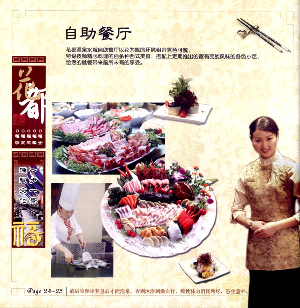 淹城花都溫泉水城孕育天地之精華,悅身、悅?cè)、悅心、悅神。置身其中泉水潺潺,霧氣繚繞、花瓣飄香,恍若仙境。“掬水月在手,弄花香滿衣”,花都溫泉的浪漫與溫潤在這里完美展現(xiàn)。 花都溫泉水城包括洗浴區(qū)、戲水世界、露天溫泉、自助餐廳、生態(tài)房、別墅區(qū)、紅文化房、VIP區(qū)等多種功能區(qū)域,是集溫泉養(yǎng)生、休閑住宿、演藝會務(wù)為—體的休閑度假勝地,給賓客帶來江南小鎮(zhèn)的浪漫水城之旅。 古木新枝畔賓客對酒當歌,溪泉石椅旁把茶品啜。 淹城-三勤生態(tài)酒店,這里是一處綠色生態(tài)的美食家園。此地鬼斧神工.奇水異石,和風細雨林中穿過,引百鳥朝來暮歌;這里集生態(tài)餐飲、演藝、中小型會務(wù)為一體,將現(xiàn)代裝飾風格和古雅拙樸的自然裝修完美整合;這里聚集大江南北名廚,推出精致綠色美昧佳肴。來到這里,賓客可享田園至美之景,品舌尖至鮮之味,實乃人生一大樂事。