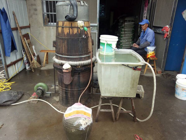 第四步:放入缸中,酒曲和糯米拌好后,便可放入屋內(nèi)的大缸中,并在其中挖出個(gè)圓形的洞,放入竹筒做酒窩。在此之前,大缸可用之前冷卻糯米飯的溫水擦一擦暖缸,這樣更有益于酒曲發(fā)酵。為了保證酒曲發(fā)酵的溫度,還要給酒料附上塑料薄膜。若是氣溫低于零度,還得多蓋上幾層棉被才行。像池阿姨家的400斤糯米,老徐至少要重復(fù)這些步驟八遍!大缸中的酒料大約發(fā)酵了10天左右,在酒乳已非常豐富之際,按照1:1的比例,打開(kāi)封口加入冷開(kāi)水,然后再蓋上棉被。繼續(xù)放置45天后,米酒才算大功告成!如果覺(jué)得米酒不過(guò)癮,老徐還會(huì)將米酒吊成燒酒,也就是白酒,依舊是傳統(tǒng)的老手藝。未來(lái)某天,TA會(huì)消失 ,其實(shí),做米酒的方法并不難,幾乎是以前家家戶戶的必備技能。然而現(xiàn)如今,不僅老常州們不再自己做酒,就連像老徐這樣的做米酒手藝人也越來(lái)越少。就連跟了老徐三十多年的一套米酒家當(dāng),也同樣經(jīng)不起歲月:鐵鍋漏了要去找橫山橋的老師傅;木桶壞了要去禮嘉修;爐子也有專門的式樣,過(guò)幾年就要拿著圖紙找人翻新......
