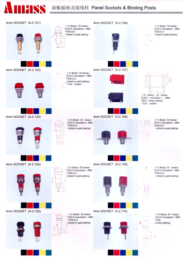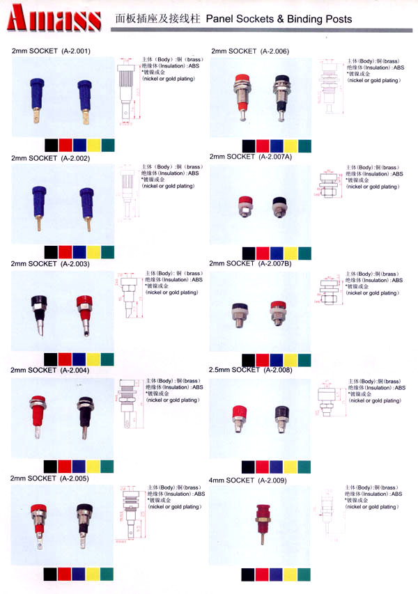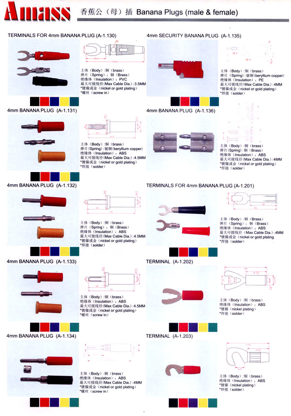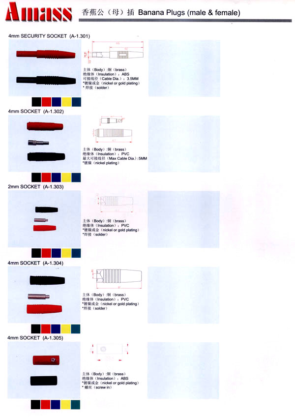 本公司專業(yè)生產(chǎn)各類香蕉插頭,香蕉插座,接線柱,電瓶夾,鱷魚夾,測試導線,測試筆等。產(chǎn)品分2mm/2.5mm/3mm/3.5mm/4mm五大系列,百余種款式, 各種香蕉插廣泛用于儀器、儀表、電力測試、教學、玩具,視聽設(shè)備、醫(yī)療儀器,保健產(chǎn)品等領(lǐng)域。公司技術(shù)力量雄厚,生產(chǎn)工藝先進,產(chǎn)品遠銷港、臺、歐美,并與飛利浦等國際品牌配套。公司本著精益求精的理念,歡迎新老客戶光臨。