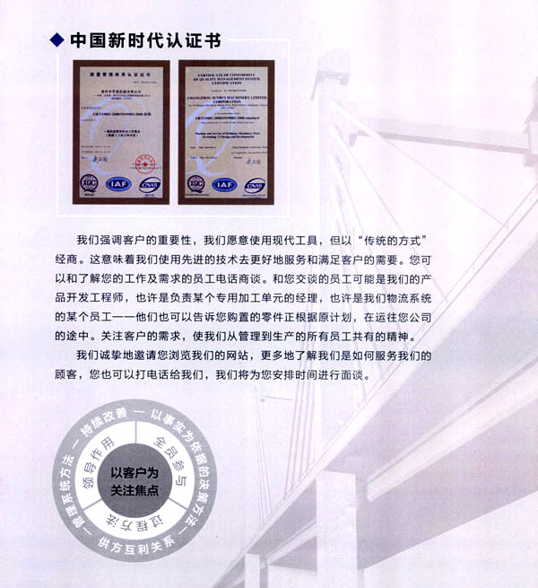 公司于2007年6月通過IS09001質(zhì)量體系認(rèn)證。本著信譽(yù)第一,誠實(shí)合作,嚴(yán)格管理為服務(wù)宗旨,全員參與、持續(xù)改善。提升品質(zhì)、準(zhǔn)時(shí)交貨、客戶滿意的質(zhì)量方針。為客戶提供優(yōu)質(zhì)的產(chǎn)品,周到的服務(wù)。嚴(yán)格的品質(zhì),快捷的送貨,完善的生產(chǎn)設(shè)備,一流的技術(shù),使公司在同行業(yè)中占有一席之地。