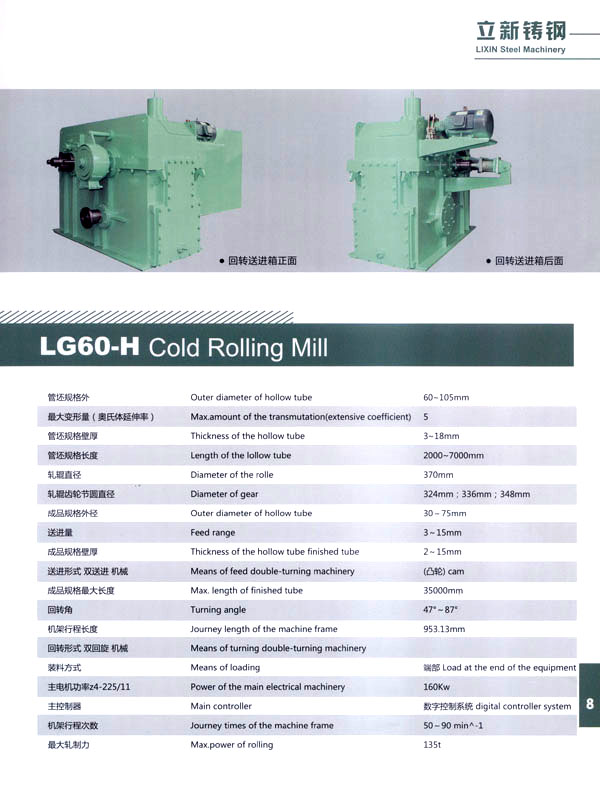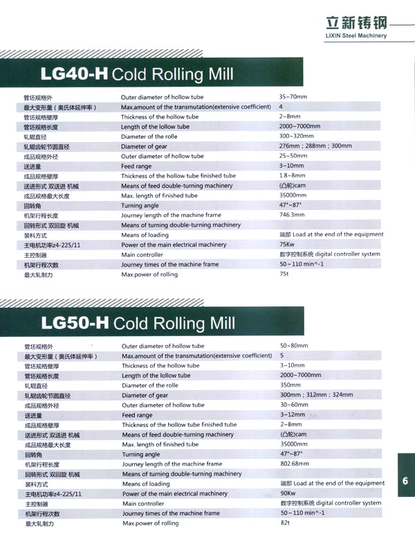 公司依靠科學(xué)進步,結(jié)合國外先進技術(shù)和國內(nèi)需求,自行設(shè)計制造LGl5一H、LG20一H、LG30一H、LG40一H、LG50一H、LG60一H、LGl20一H型系列長行程環(huán)孔冷軋管機。對不銹鋼、碳鋼和有色金屬大減徑、大減壁軋制。亦可生產(chǎn)耐熱鑄鋼件、普通鑄鋼件、大型離心澆鑄件、大型軋輥堆焊等,同時可以為客戶加工生產(chǎn)大中型硬齒面齒輪及各類機械零部件備件。