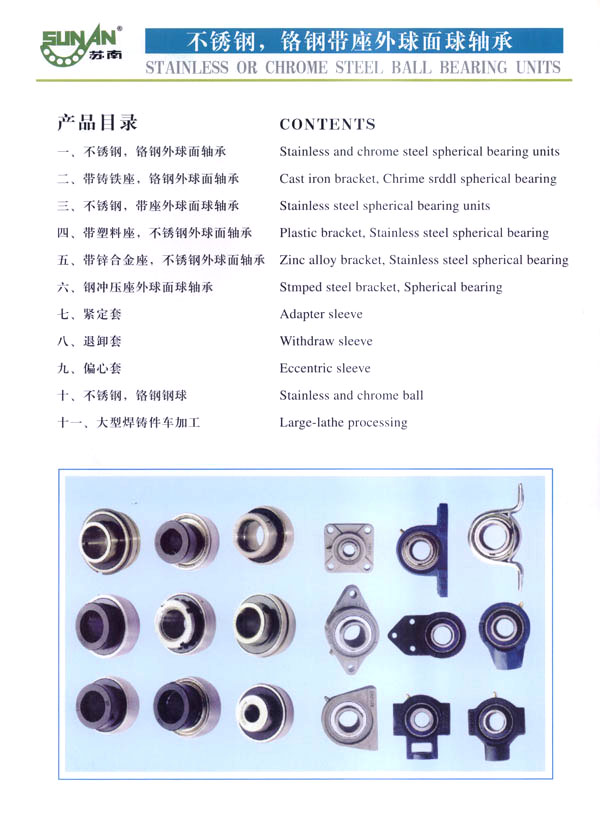 常州市武進(jìn)蘇南軸承有限公司是生產(chǎn)鋼球及帶座外球面軸承的專業(yè)工廠,主要生產(chǎn)蘇南牌“SN”不銹鋼球、鉻鋼鋼球,以及不銹鋼、鉻鋼UC、UCX、UK、HC、SB、SA、SER、UOOO、KOOO及其它非標(biāo)系列各類帶座外球面軸承、偏心套、緊定套等產(chǎn)品。本廠生產(chǎn)規(guī)格有軸承鋼球0.5-150m/m,碳鋼球0.5-150m/m,不銹鋼球0.8-50m/m,同時定做各種特殊規(guī)格的不銹鋼球、銅球、陶瓷球等。為廣大用戶提供品質(zhì)優(yōu)良,規(guī)格齊全,價格合理的各種鋼球。 本公司位于常州南部,錫宜高速公路串境而過, 交通便利。南瀕風(fēng)景秀麗的太湖,沿湖丘陵地帶人文景觀豐富,為常州市武進(jìn)區(qū)太湖旅游度假區(qū) 。本廠環(huán)境優(yōu)美,具有良好的生產(chǎn)環(huán)境,我們竭誠歡迎國內(nèi)外的朋友進(jìn)行廣泛多樣的經(jīng)濟(jì)合作交往和貿(mào)易合作,并為你提供優(yōu)良的服務(wù)。 本公司技術(shù)力量雄厚,工藝裝備先進(jìn),檢測手段完備,產(chǎn)品質(zhì)量穩(wěn)定,使用性能各項(xiàng)指標(biāo)都達(dá)到國際先進(jìn)水平,產(chǎn)品主要銷往美國、法國、德國、日本、意大利、澳大利亞、韓國、加拿大、及東南亞等國家和地區(qū)。本公司的“SN”商標(biāo)鋼球及帶座外球面軸承已贏得國內(nèi)外廣大用戶的信賴。 本公司具有外貿(mào)自營出口權(quán),并于2002年9月通過ISO9001-2000版質(zhì)量體系認(rèn)證,于2004年8月通過“CQC”產(chǎn)品質(zhì)量認(rèn)證。