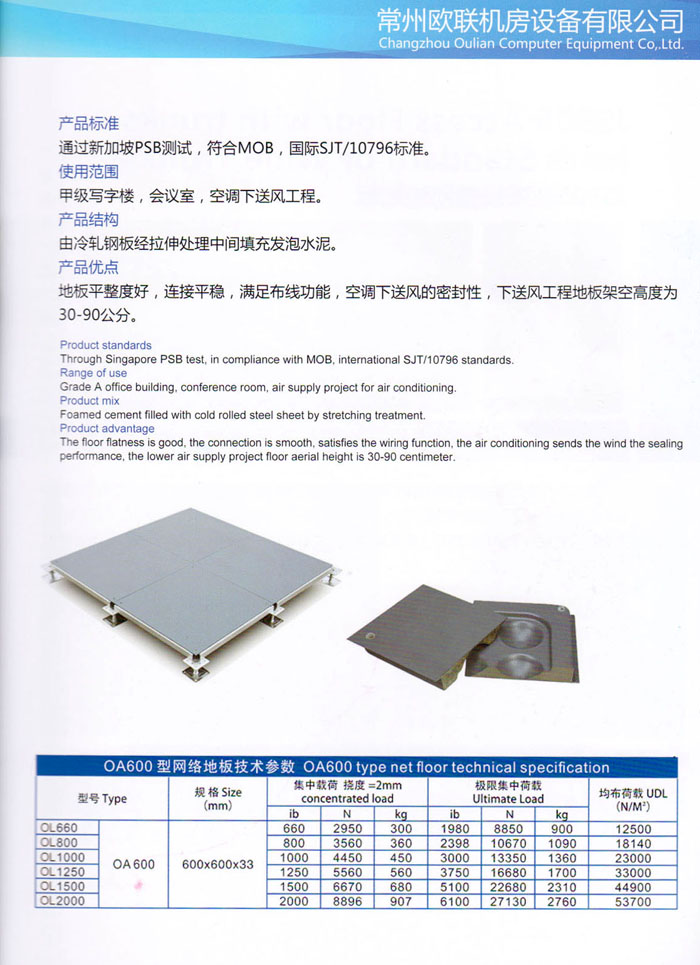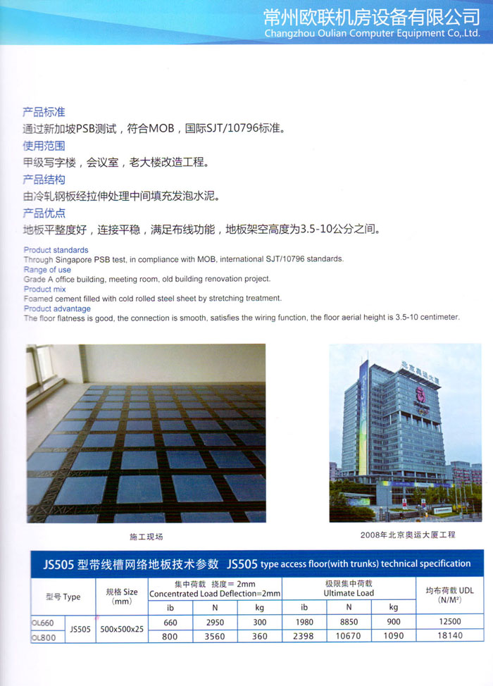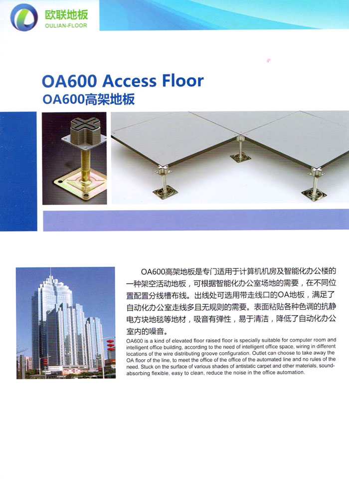 防靜電高架活動(dòng)地板、全鋼地板、陶瓷地板是計(jì)算機(jī)行業(yè)發(fā)展起來(lái)的新型鋪地材料,隔離了潮氣、靜電灰塵,最重要的是解決了綜合布線問(wèn)題,無(wú)需預(yù)埋管線,可隨時(shí)拆卸、搬移,保證了資訊設(shè)備完整的優(yōu)點(diǎn),適應(yīng)了智能化樓宇中信息自動(dòng)化技術(shù)對(duì)所處環(huán)境的特定要求,避免了廣大客戶的雙重投資,使現(xiàn)代化辦公程度更加高效,辦公場(chǎng)所更加舒適。 “歐聯(lián)”系列全鋼地板,符合國(guó)家安全要求,種類完備多樣,其中防靜電陶瓷地板、硫酸鈣地板等除具有普通瓷質(zhì)的裝飾和實(shí)用性外,其耐磨、防水、防火功能優(yōu)于其它同類產(chǎn)品,防靜電系列地板,能切合不同客戶的要求,其靈活的配置,深受客戶歡迎,不同材質(zhì)的地板結(jié)構(gòu)使設(shè)計(jì)師的設(shè)計(jì)空間比傳統(tǒng)的更加廣闊自由和善變。 公司大力發(fā)展國(guó)內(nèi)外銷售業(yè)務(wù),多次中標(biāo)國(guó)內(nèi)重點(diǎn)工程 ,例:哈爾濱醫(yī)科大學(xué)、山東大學(xué)、上海普通機(jī)場(chǎng)等。 公司將一如既往開發(fā)和制造一流的產(chǎn)品,愿與廣大有識(shí)之士合作發(fā)展,共創(chuàng)美好未來(lái)。
