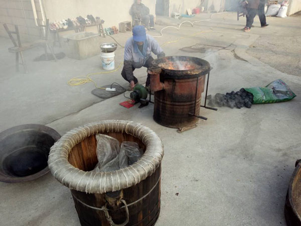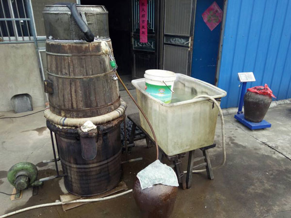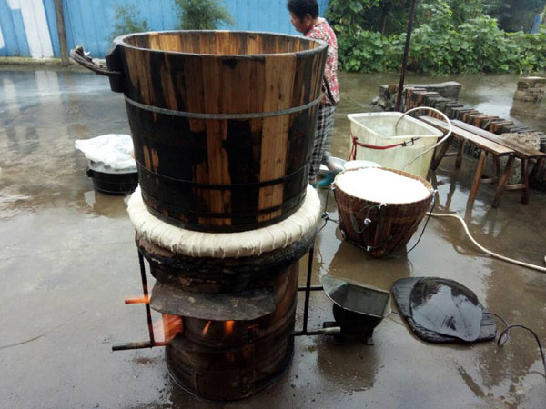 第四步:放入缸中,酒曲和糯米拌好后,便可放入屋內的大缸中,并在其中挖出個圓形的洞,放入竹筒做酒窩。在此之前,大缸可用之前冷卻糯米飯的溫水擦一擦暖缸,這樣更有益于酒曲發(fā)酵。為了保證酒曲發(fā)酵的溫度,還要給酒料附上塑料薄膜。若是氣溫低于零度,還得多蓋上幾層棉被才行。像池阿姨家的400斤糯米,老徐至少要重復這些步驟八遍!大缸中的酒料大約發(fā)酵了10天左右,在酒乳已非常豐富之際,按照1:1的比例,打開封口加入冷開水,然后再蓋上棉被。繼續(xù)放置45天后,米酒才算大功告成!如果覺得米酒不過癮,老徐還會將米酒吊成燒酒,也就是白酒,依舊是傳統(tǒng)的老手藝。未來某天,TA會消失 ,其實,做米酒的方法并不難,幾乎是以前家家戶戶的必備技能。然而現(xiàn)如今,不僅老常州們不再自己做酒,就連像老徐這樣的做米酒手藝人也越來越少。就連跟了老徐三十多年的一套米酒家當,也同樣經不起歲月:鐵鍋漏了要去找橫山橋的老師傅;木桶壞了要去禮嘉修;爐子也有專門的式樣,過幾年就要拿著圖紙找人翻新......