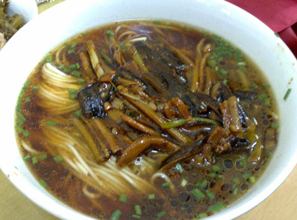 常州新北區(qū)孟河公陽小吃店從事鱔絲面23年,經(jīng)營面積100平方米,黃鱔全是野生,面湯采用高湯制作(鱔魚湯),下面的時候先用開水把黃鱔燙熟,然后用竹刀批下二條黃鱔肉,除去骨頭肚腸,切成段后入油鍋里炸酥,再用白湯烹制成為面澆頭。而面湯是用鱔魚骨頭、豬骨等用大鍋猛火煮上三、四個鐘頭,成為一鍋濃濃的白湯,再進(jìn)行調(diào)味,吃到嘴里全身舒坦。