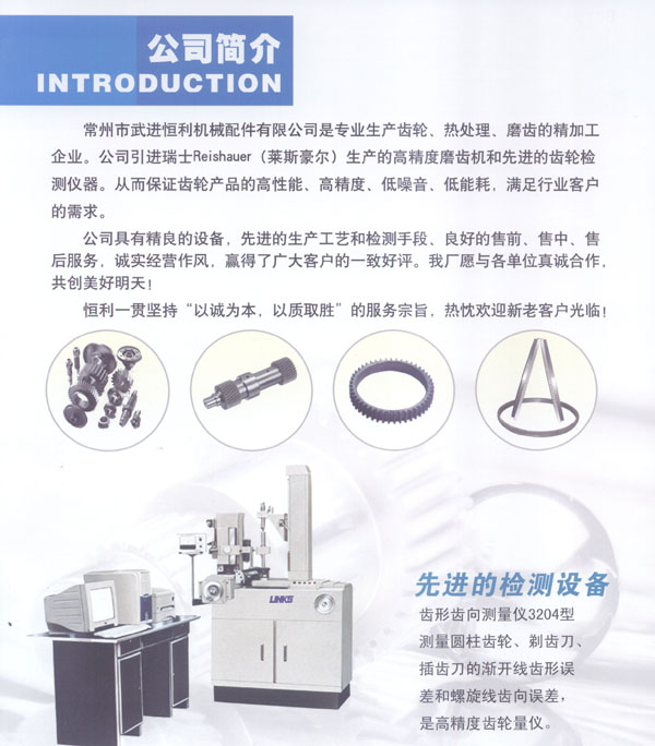 常州市武進(jìn)恒利機(jī)械配件有限公司是專業(yè)生產(chǎn)齒輪、熱處理、磨齒的精加工企業(yè)。公司引進(jìn)瑞士Reishauer(菜斯豪爾)生產(chǎn)的高精度磨齒機(jī)和先進(jìn)的齒輪檢測儀器。從而保證齒輪產(chǎn)品的高-性能、高精度、低噪音、低能耗,滿足行業(yè)客戶的需求。 公司具有精良的設(shè)備,先進(jìn)的生產(chǎn)工藝和檢測手段、良好的售前、售中、售后服務(wù),誠實(shí)經(jīng)營作風(fēng),贏得了廣大客戶的一致好評(píng)。我廠愿與各單位真誠合作,共創(chuàng)美好明天! 恒利一貫堅(jiān)持“以誠為本,以質(zhì)取勝”的服務(wù)宗旨,熱忱歡迎新老客戶光臨!