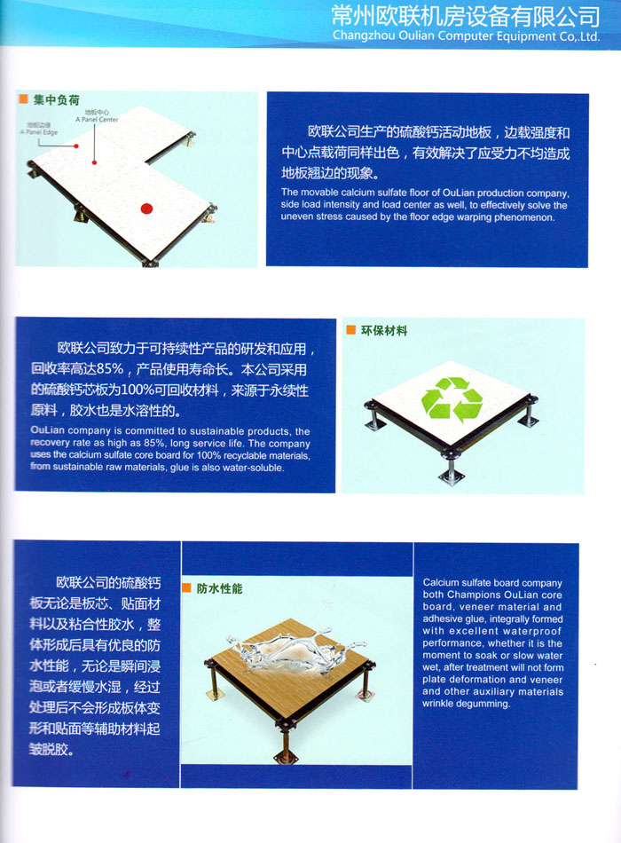 “歐聯(lián)”系列全鋼地板,符合國(guó)家安全要求,種類完備多樣,其中防靜電陶瓷地板、硫酸鈣地板等除具有普通瓷質(zhì)的裝飾和實(shí)用性外,其耐磨、防水、防火功能優(yōu)于其它同類產(chǎn)品,防靜電系列地板,能切合不同客戶的要求,其靈活的配置,深受客戶歡迎,不同材質(zhì)的地板結(jié)構(gòu)使設(shè)計(jì)師的設(shè)計(jì)空間比傳統(tǒng)的更加廣闊自由和善變。