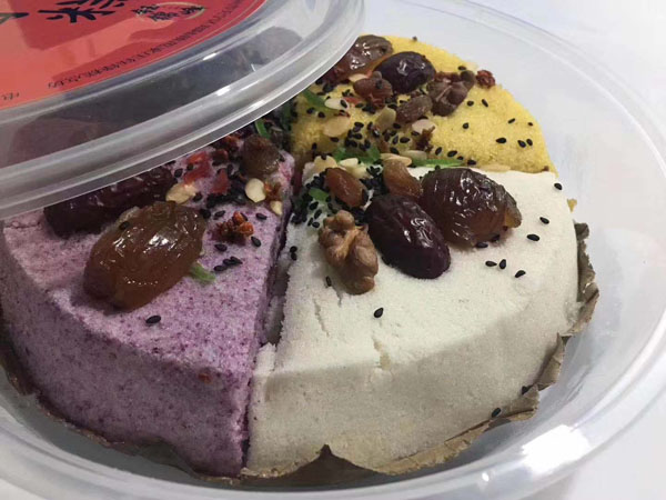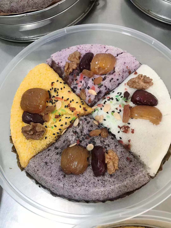 腳踏糕本名“年糕”,按常州周邊地區(qū)的風(fēng)俗習(xí)慣,在春季前夕,各家各戶都要蒸年糕,吃年糕!案狻敝C音“高”,過年吃年糕被賜予“年年高”,一年高一年,鋒吉祥之意,表達(dá)這人們對(duì)未來美好生活的憧憬和良好的祝愿。今天小編要帶大家的就是一家至今保持著傳統(tǒng)手工制作的鈺鋒糕點(diǎn)坊。 鈺鋒糕點(diǎn)坊位于常州鄭陸鎮(zhèn)三皇廟范家莊,一個(gè)比較偏僻的村莊,雖然這家作坊不大,但香糯絲滑,軟糯適中,韌勁十足的腳踏糕吸引了無數(shù)的食客。制作一條腳踏糕要從淘米,浸泡,碾粉,鋪粉,一層一層的鋪下去,需要無數(shù)道制作工序,這些都是店主孫煥公公老周,憑著幾十年的經(jīng)驗(yàn),加上店主孫煥從不馬虎的決心! 這“腳踏”也并非赤腳上陣,而是把蒸好的糕倒入早以準(zhǔn)備好的框子里,用布包裹好,上面再用薄膜包好,再蓋上布,再換上專門腳踏的布鞋,踩的時(shí)候要?jiǎng)蚍Q,左右腳要配合好,不然糕會(huì)高高低低,不平整,最后再拿蠟燭線拆成一條小長條,再拿帶包裝好,如此又香又糯的腳踏糕就大功告成了。 店主孫煥為了讓更多的人認(rèn)識(shí)和了解常州腳踏糕的傳統(tǒng)文化和美食,她在傳統(tǒng)工藝中增加了適合現(xiàn)代文化的多種口味,她在糕里加入南瓜,紫薯,老紅糖,大麥汁,血糯米,核桃,葡萄干,紅棗等食材,做出五顏六色,純天然的口味,深受食客們的喜愛,不管是送人還是自己吃都非常新穎。 (重陽糕)重陽糕的由來,九九重陽,九是陽數(shù),也是陽數(shù)中最大的數(shù),九月初九,兩九相重,為之重陽,古人有重陽登高的習(xí)俗。高于糕同意,寓意人活九十九,生活步步高,秋景勝春光,夕陽無限好。夕陽紅成了老人對(duì)自己美好的祝愿和希望,所以從某種意義上來講它“祝壽糕”“長壽糕”重陽糕在常州地區(qū)是家喻戶曉的,下面小編帶你去一家至今保持傳統(tǒng)手工制作的鈺鋒糕點(diǎn)坊看一下吧。鈺鋒糕點(diǎn)坊位于常州市天寧區(qū)鄭陸鎮(zhèn)三皇廟范家莊,偏僻的小村莊,雖然有點(diǎn)偏僻,但是每到重陽節(jié)到來,每天還是有很多食客來訂購和購買店主孫煥做的多種口味的重陽糕。要想做出松軟香糯的重陽糕,原材料和糯米和梗米的配比也很重要,調(diào)整好比例開始淘米,浸泡,釓粉,放入糖攪拌,篩粉,糕底部放上荷葉,中間的餡心都是孫煥自己熬制,口感,香糯松軟,店主孫煥為了吸引更多現(xiàn)代年輕人,她在粉里加入南瓜,紫薯,紅糖,血糯等,色彩搭配很出跳,吸引來了很多食客,孫煥2019年開始自愿捐贈(zèng)重陽糕給敬老院,她說這樣的公益活動(dòng)自己很喜歡,雖然金額不大,缺表達(dá)了她的一份心意,并稱這樣的公益活動(dòng)她每年都會(huì)做。