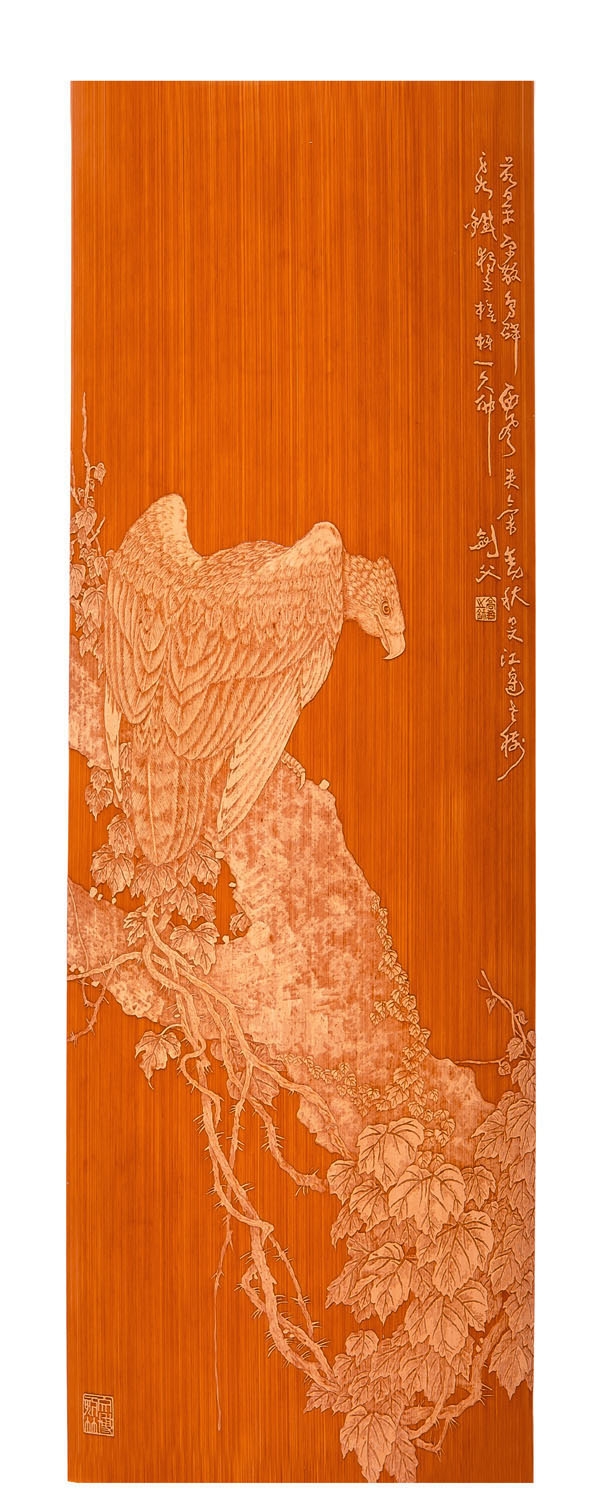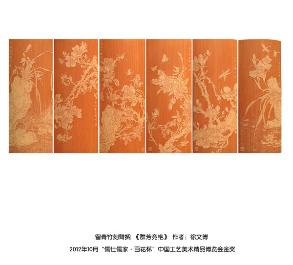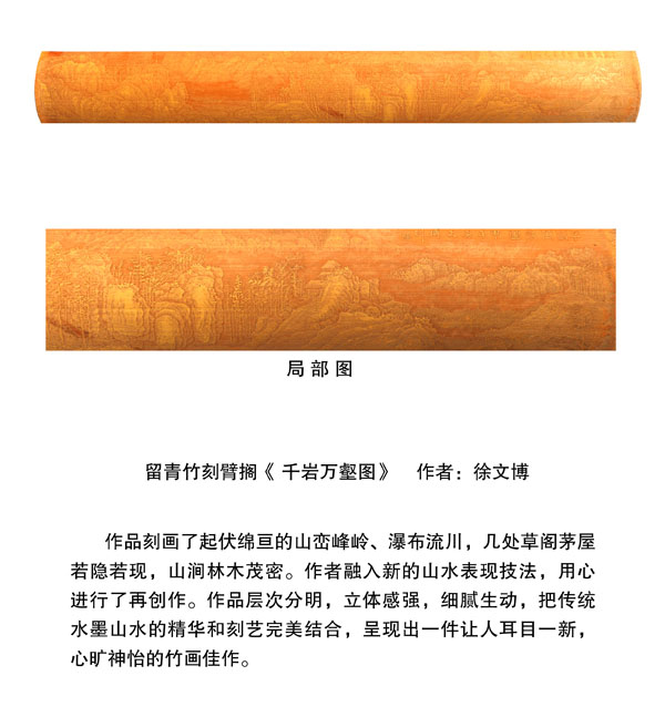徐博(藝名文博),1973年生,江蘇武進人,江蘇省省名人,高級工藝美術師,常州市留青竹刻非遺傳承人,常州工藝美術家協(xié)會理事,被譽為當今中國最具創(chuàng)新意識的新銳竹刻家代表,多次獲得國家工藝美術大獎。酷愛留青竹刻的徐文博賞竹為樂,以竹詠志,借竹抒懷,悉心探索留青竹刻的藝術表現(xiàn)。在中國工藝美術大師蕭劍波的精心指導下,開創(chuàng)留青水墨山水之技法,更好的體現(xiàn)了竹刻淡雅清秀的藝術風格,并不斷汲取書畫、攝影、雕塑等藝術精華,不斷滋養(yǎng)藝術情趣,提升擴展胸襟人格的同時也逐步形成了其形神兼?zhèn),虛實相生,氣韻生動的藝術特點,作品為眾多的國內(nèi)外收藏家珍藏。