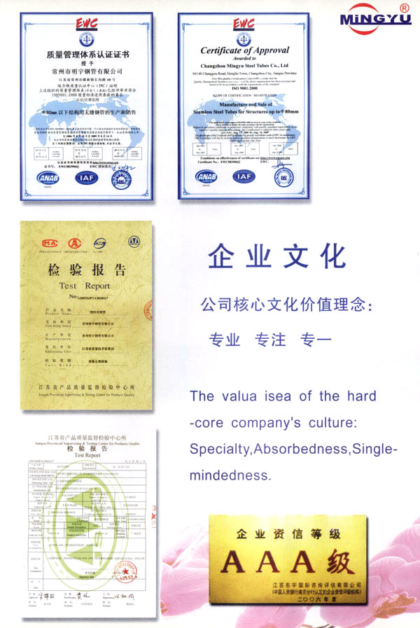 常州市明宇鋼管有限公司位于江南水鄉(xiāng)常州與無錫之間,緊臨滬寧高速,312國道,沿江高速,錫宜高速,京杭大運河,交通極為方便。 公司創(chuàng)建于1992年,固定資產(chǎn)2500萬元,車間面積15000平方米,現(xiàn)有職工220人,技術(shù)員30人,穿孔機組外徑40-80兩套,冷拔機組10T-80T八套,輥底式熱處理爐一套,形成年產(chǎn)30000噸各類無縫鋼管的生產(chǎn)能力。另有半自動鋼鋸切割機八臺,儀表倒角機18臺,電鍍鋅槽3條,形成從切割、倒角、電鍍的鋼管深加工能力,年產(chǎn)紡機牽伸管、紗管、編織機筒管1000萬支的生產(chǎn)能力。 集行業(yè)之精華,全新的設(shè)備,完備的檢測手段,嚴格的管理措施,良好的服務(wù)宗旨,高素質(zhì)的員工隊伍,在多年的生產(chǎn)實踐經(jīng)驗基礎(chǔ)上,保障了出廠產(chǎn)品的質(zhì)量,以質(zhì)量求生存,以信譽求市場,以科技求發(fā)展,以價格求客戶的經(jīng)營理念,竭誠為社會各界用戶提供一流服務(wù)。