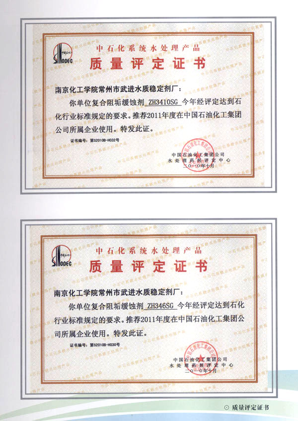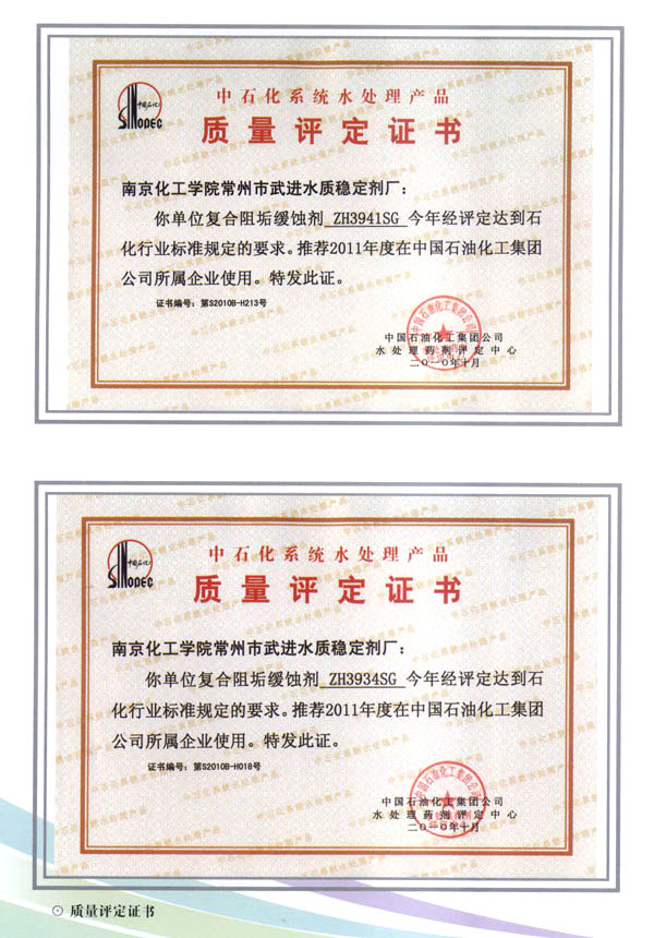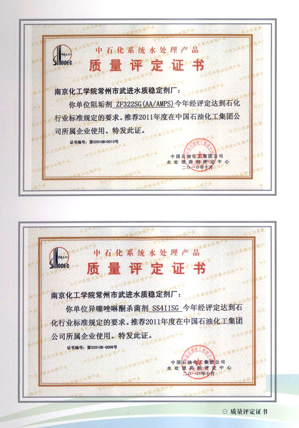 企業(yè)運(yùn)用嚴(yán)密的科學(xué)管理,配有先進(jìn)的工藝技術(shù)和精良的生產(chǎn)裝備,保持高標(biāo)準(zhǔn)的產(chǎn)品質(zhì)量。所生產(chǎn)的水質(zhì)穩(wěn)定劑達(dá)到或超過(guò)國(guó)際先進(jìn)水平,擁有PBTCA等多個(gè)江蘇省高新技術(shù)產(chǎn)品,DPSC緩蝕阻垢劑被列為國(guó)家星火計(jì)劃項(xiàng)目,工業(yè)循環(huán)水用新型緩蝕阻垢殺菌劑被國(guó)務(wù)院評(píng)為國(guó)家科技進(jìn)步二等獎(jiǎng)。主要產(chǎn)品均通過(guò)部、省級(jí)科技成果鑒定,連續(xù)十多年被中國(guó)石化總公司評(píng)定為合格推薦產(chǎn)品。企業(yè)已通過(guò)IS09001、IS014001國(guó)際質(zhì)量、環(huán)境認(rèn)證,為國(guó)內(nèi)外石化行業(yè)、冶金、鋼鐵、化肥、電力、紡織等領(lǐng)域的工業(yè)循環(huán)冷卻水的水質(zhì)處理提供了必不可少的配套產(chǎn)品。