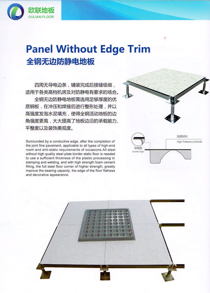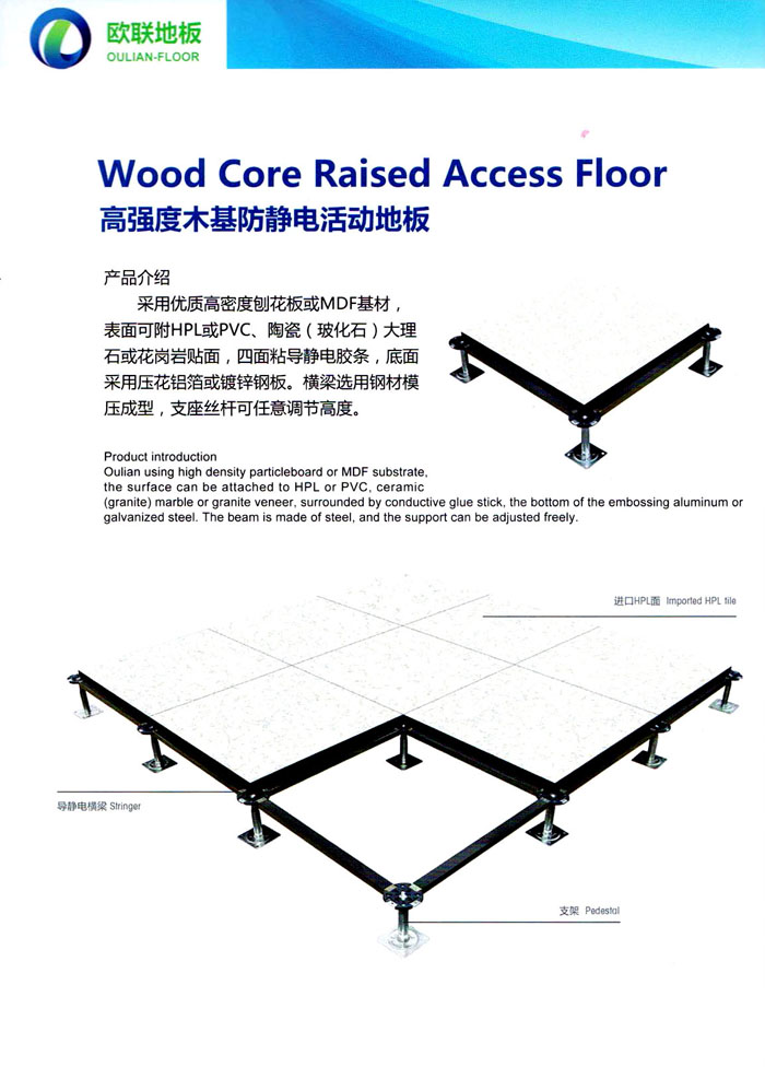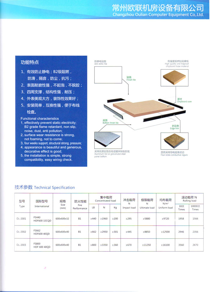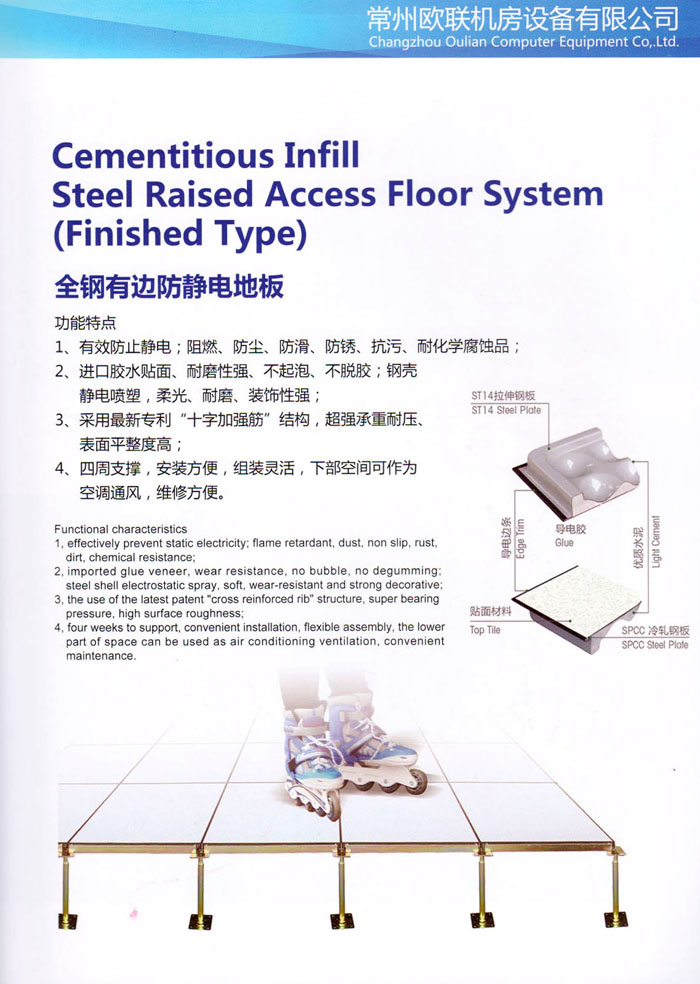 防靜電高架活動(dòng)地板、全鋼地板、陶瓷地板是計(jì)算機(jī)行業(yè)發(fā)展起來的新型鋪地材料,隔離了潮氣、靜電灰塵,最重要的是解決了綜合布線問題,無需預(yù)埋管線,可隨時(shí)拆卸、搬移,保證了資訊設(shè)備完整的優(yōu)點(diǎn),適應(yīng)了智能化樓宇中信息自動(dòng)化技術(shù)對所處環(huán)境的特定要求,避免了廣大客戶的雙重投資,使現(xiàn)代化辦公程度更加高效,辦公場所更加舒適。 “歐聯(lián)”系列全鋼地板,符合國家安全要求,種類完備多樣,其中防靜電陶瓷地板、硫酸鈣地板等除具有普通瓷質(zhì)的裝飾和實(shí)用性外,其耐磨、防水、防火功能優(yōu)于其它同類產(chǎn)品,防靜電系列地板,能切合不同客戶的要求,其靈活的配置,深受客戶歡迎,不同材質(zhì)的地板結(jié)構(gòu)使設(shè)計(jì)師的設(shè)計(jì)空間比傳統(tǒng)的更加廣闊自由和善變。 公司大力發(fā)展國內(nèi)外銷售業(yè)務(wù),多次中標(biāo)國內(nèi)重點(diǎn)工程 ,例:哈爾濱醫(yī)科大學(xué)、山東大學(xué)、上海普通機(jī)場等。 公司將一如既往開發(fā)和制造一流的產(chǎn)品,愿與廣大有識之士合作發(fā)展,共創(chuàng)美好未來。