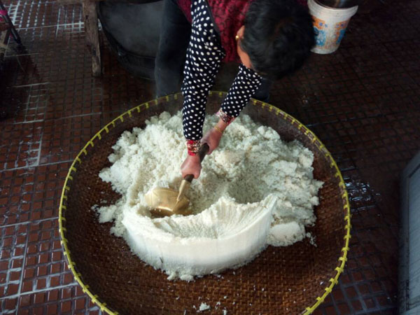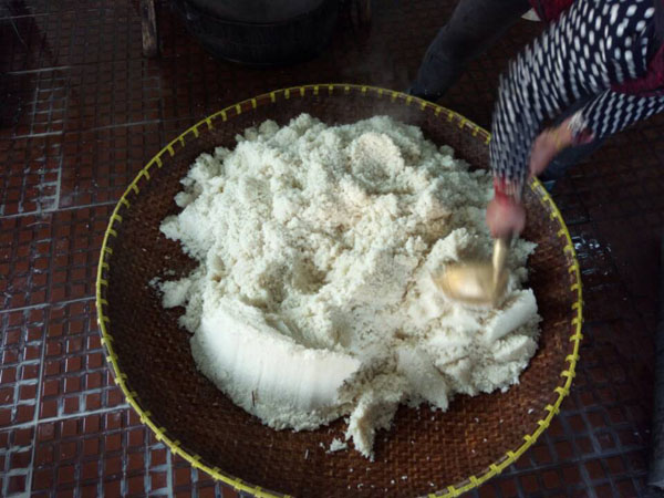 第三步:拌入酒曲,這時(shí)候才發(fā)現(xiàn)了“木桶”的神奇之處:一頭空,另一頭也是空,只不過(guò)用鋼筋做了個(gè)柵欄。之前蒸米飯,老徐是墊上了蒲草,一方面讓糯米飯更易熟,另一方面也增加了糯米飯的清香氣息。把糯米飯倒入蠶匾中,邊翻動(dòng)糯米飯邊撒上酒曲,使酒曲與糯米飯充分拌勻。