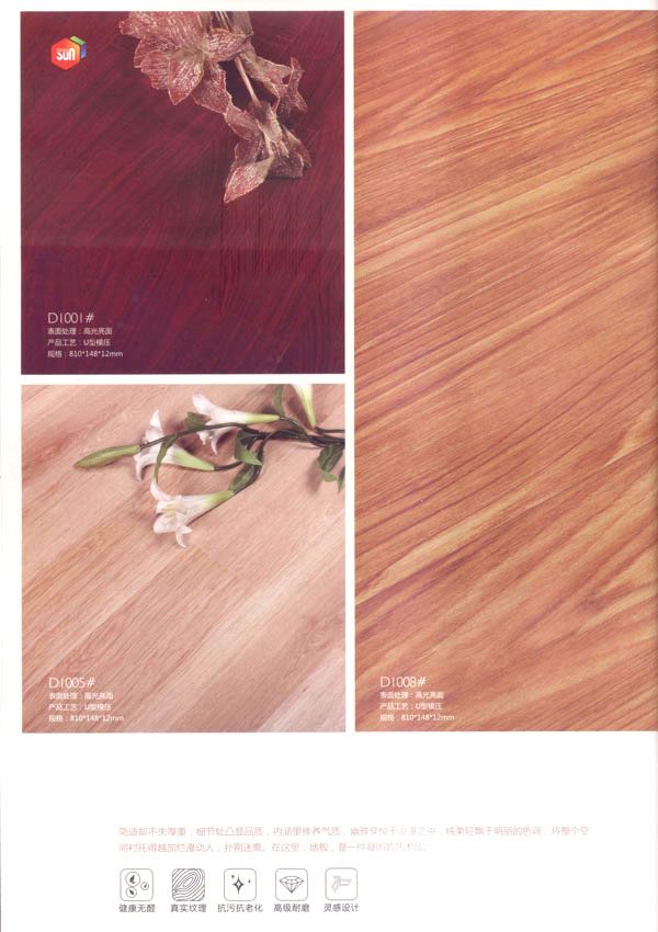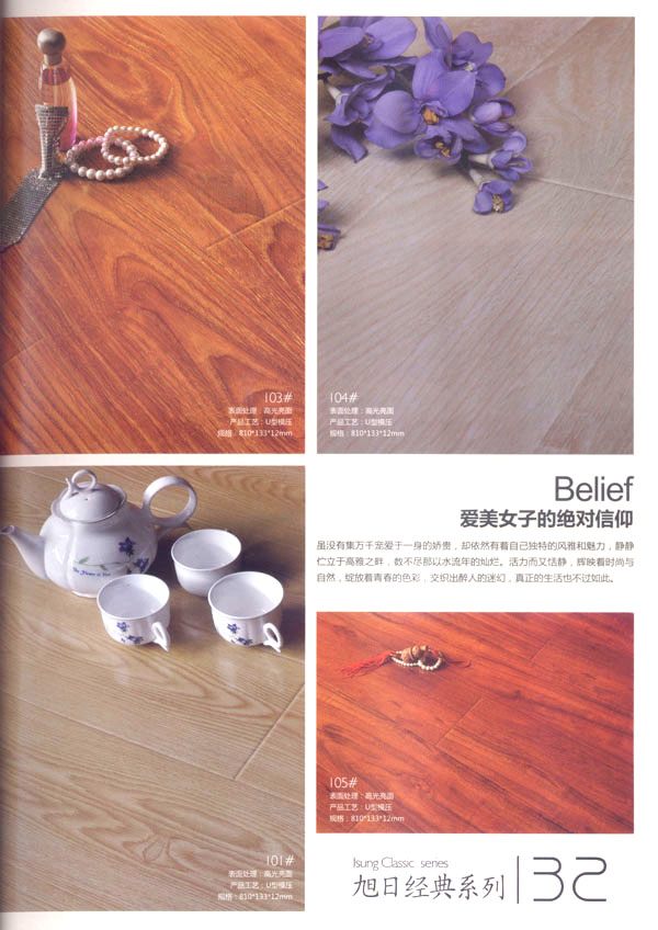 品牌保證,質(zhì)量放心 公司旗下“霞光.旭日”品牌地板系列由旭日皇家、旭日經(jīng)典、旭日戀家、至尊奢華、巧奪天工、水晶陶瓷等幾個(gè)系列構(gòu)成,配有專職質(zhì)量檢驗(yàn)人員,嚴(yán)把產(chǎn)品質(zhì)量關(guān),不斷完善產(chǎn)品質(zhì)量體系、監(jiān)控管理體系。公司對客戶需求全面、科學(xué)、準(zhǔn)確地把握,確保對客戶市場適時(shí)高效反應(yīng)。一流的設(shè)備、精心的選材、完美的工藝以及對產(chǎn)品品味不倦的追求,令奔公司產(chǎn)品獨(dú)樹一幟。