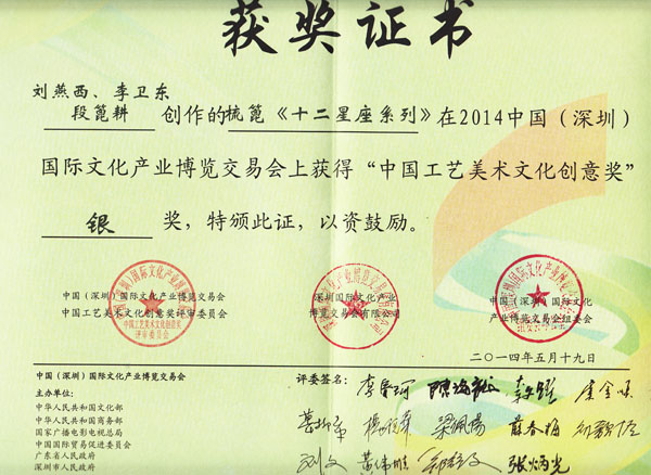 公司榮譽(yù)介紹: “2009年常州市旅游商品創(chuàng)新設(shè)計(jì)大賽”,“覽盡千荷”綠檀雕刻梳榮獲三等獎(jiǎng); “2011年常州市旅游商品創(chuàng)新設(shè)計(jì)大賽”,“彩印工藝梳-我們的年代(80)”榮獲二等獎(jiǎng)。 “2011年中國(guó)包裝創(chuàng)意設(shè)計(jì)大賽“,虞美人彩印梳篦系列包裝獲得一等獎(jiǎng); “2011年中國(guó)包裝創(chuàng)意設(shè)計(jì)大賽”,虞美人筷子系列包裝獲得三等獎(jiǎng); “2011創(chuàng)意中國(guó).第五屆設(shè)計(jì)藝術(shù)大獎(jiǎng)賽”,虞美人系列包裝獲得三等獎(jiǎng); “2011首屆中國(guó)(無錫)國(guó)際文化藝術(shù)博覽會(huì)”,漆藝對(duì)梳《喜玫瑰》獲得“藝博杯“銅獎(jiǎng)。 “第十三屆中國(guó)工藝美術(shù)大師作品暨國(guó)際藝術(shù)精品博覽會(huì)”, 漆藝梳《報(bào)喜鳥》榮獲2012“儒士儒家•百花杯”中國(guó)工藝美術(shù)精品獎(jiǎng)優(yōu)秀獎(jiǎng) “第十三屆中國(guó)工藝美術(shù)大師作品暨國(guó)際藝術(shù)精品博覽會(huì)”, 虞美人《渾然天成》榮獲2012“儒士儒家•百花杯”中國(guó)工藝美術(shù)精品獎(jiǎng)金獎(jiǎng) “2012江蘇省工藝美術(shù)精品大獎(jiǎng)賽”,虞美人《S型梳》喜獲“藝博杯”銀獎(jiǎng) “第十四屆中國(guó)工藝美術(shù)大師作品暨國(guó)際藝術(shù)精品博覽會(huì)”, 虞美人工藝梳《新型十二星座梳》榮獲2013“國(guó)信•百花杯”中國(guó)工藝美術(shù)精品獎(jiǎng)優(yōu)秀獎(jiǎng) “2013【藝博杯】江蘇省工藝美術(shù)精品大獎(jiǎng)賽”,虞美人《萬事如意系列》喜獲“藝博杯”銀獎(jiǎng) “2013江蘇省工藝美術(shù)新人新作成果展作品大獎(jiǎng)賽”,虞美人《壺(福)的藝術(shù)》喜獲“藝博杯”入圍獎(jiǎng) 2013年度江蘇省“蘇商領(lǐng)袖峰會(huì)”,常州市卓尚飾品有限公司榮獲最具成長(zhǎng)性企業(yè)獎(jiǎng) 常州市卓尚飾品(虞美人)有限公司總經(jīng)理李衛(wèi)東榮獲“常州創(chuàng)意產(chǎn)業(yè)協(xié)會(huì)2013年底慈善獎(jiǎng)榮譽(yù)” 常州市卓尚飾品有限公司榮獲薛家鎮(zhèn)人民政府2013年度“創(chuàng)新創(chuàng)優(yōu)”獎(jiǎng) 常州市卓尚飾品有限公司榮獲薛家鎮(zhèn)人民政府2013年度“銷售業(yè)績(jī)”獎(jiǎng) 2014中國(guó)(深圳)國(guó)際文化產(chǎn)業(yè)博覽交易會(huì),劉燕西、李衛(wèi)東、段筆耕<十二星座系列>獲得“中國(guó)工藝美術(shù)文化創(chuàng)意獎(jiǎng)”銀獎(jiǎng) 2014中國(guó)(深圳)國(guó)際文化產(chǎn)業(yè)博覽交易會(huì),徐德鴻、李衛(wèi)東、段筆耕《漆彩人生系列》獲得“中國(guó)工藝美術(shù)文化創(chuàng)意獎(jiǎng)”銅獎(jiǎng) 文化創(chuàng)意大獎(jiǎng)賽“紫金獎(jiǎng)” ,有余(魚)系列梳篦產(chǎn)品獲得了優(yōu)秀獎(jiǎng) 2014吟飛杯首屆常州文化創(chuàng)意和設(shè)計(jì)大賽,虞美人有余(魚)系列梳篦產(chǎn)品榮獲優(yōu)秀設(shè)計(jì)獎(jiǎng) 2014吟飛杯首屆常州文化創(chuàng)意和設(shè)計(jì)大賽,虞美人“云,月”系列梳篦產(chǎn)品榮獲優(yōu)秀設(shè)計(jì)獎(jiǎng) 2014藝博杯江蘇省工藝美術(shù)精品大獎(jiǎng)賽,虞美人《梳篦:酒醉的探戈》喜獲銀獎(jiǎng) 2014“中國(guó)原創(chuàng)•百花杯”中國(guó)工藝美術(shù)精品大獎(jiǎng)賽,虞美人《梳篦-江南風(fēng)韻系列》喜獲銀獎(jiǎng) 常州市卓尚飾品有限公司獲“2014年常州市電子商務(wù)協(xié)會(huì)2014年度優(yōu)秀會(huì)員單位” 2014“虞美人”成為常州市知名商標(biāo)。