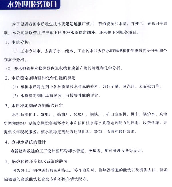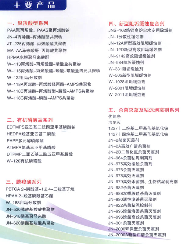企業(yè)運(yùn)用嚴(yán)密的科學(xué)管理,配有先進(jìn)的工藝技術(shù)和精良的生產(chǎn)裝備,保持高標(biāo)準(zhǔn)的產(chǎn)品質(zhì)量。所生產(chǎn)的水質(zhì)穩(wěn)定劑達(dá)到或超過(guò)國(guó)際先進(jìn)水平,擁有PBTCA等多個(gè)江蘇省高新技術(shù)產(chǎn)品,DPSC緩蝕阻垢劑被列為國(guó)家星火計(jì)劃項(xiàng)目,工業(yè)循環(huán)水用新型緩蝕阻垢殺菌劑被國(guó)務(wù)院評(píng)為國(guó)家科技進(jìn)步二等獎(jiǎng)。主要產(chǎn)品均通過(guò)部、省級(jí)科技成果鑒定,連續(xù)十多年被中國(guó)石化總公司評(píng)定為合格推薦產(chǎn)品。企業(yè)已通過(guò)IS09001、IS014001國(guó)際質(zhì)量、環(huán)境認(rèn)證,為國(guó)內(nèi)外石化行業(yè)、冶金、鋼鐵、化肥、電力、紡織等領(lǐng)域的工業(yè)循環(huán)冷卻水的水質(zhì)處理提供了必不可少的配套產(chǎn)品。