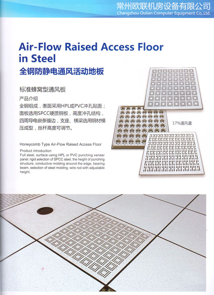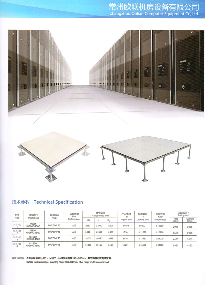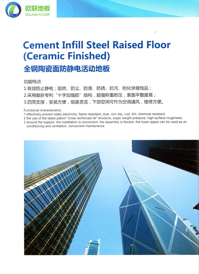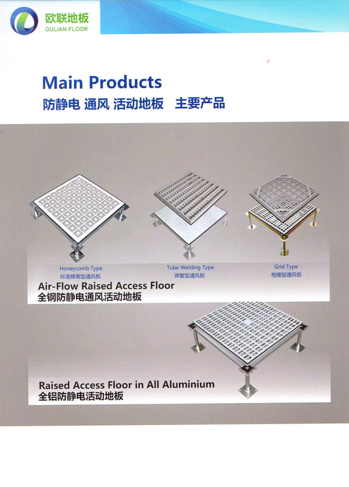 防靜電高架活動(dòng)地板、全鋼地板、陶瓷地板是計(jì)算機(jī)行業(yè)發(fā)展起來(lái)的新型鋪地材料,隔離了潮氣、靜電灰塵,最重要的是解決了綜合布線問(wèn)題,無(wú)需預(yù)埋管線,可隨時(shí)拆卸、搬移,保證了資訊設(shè)備完整的優(yōu)點(diǎn),適應(yīng)了智能化樓宇中信息自動(dòng)化技術(shù)對(duì)所處環(huán)境的特定要求,避免了廣大客戶(hù)的雙重投資,使現(xiàn)代化辦公程度更加高效,辦公場(chǎng)所更加舒適。 “歐聯(lián)”系列全鋼地板,符合國(guó)家安全要求,種類(lèi)完備多樣,其中防靜電陶瓷地板、硫酸鈣地板等除具有普通瓷質(zhì)的裝飾和實(shí)用性外,其耐磨、防水、防火功能優(yōu)于其它同類(lèi)產(chǎn)品,防靜電系列地板,能切合不同客戶(hù)的要求,其靈活的配置,深受客戶(hù)歡迎,不同材質(zhì)的地板結(jié)構(gòu)使設(shè)計(jì)師的設(shè)計(jì)空間比傳統(tǒng)的更加廣闊自由和善變。 公司大力發(fā)展國(guó)內(nèi)外銷(xiāo)售業(yè)務(wù),多次中標(biāo)國(guó)內(nèi)重點(diǎn)工程 ,例:哈爾濱醫(yī)科大學(xué)、山東大學(xué)、上海普通機(jī)場(chǎng)等。 公司將一如既往開(kāi)發(fā)和制造一流的產(chǎn)品,愿與廣大有識(shí)之士合作發(fā)展,共創(chuàng)美好未來(lái)。