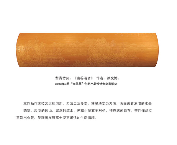 徐博(藝名文博),1973年生,江蘇武進(jìn)人,江蘇省省名人,高級(jí)工藝美術(shù)師,常州市留青竹刻非遺傳承人,常州工藝美術(shù)家協(xié)會(huì)理事,被譽(yù)為當(dāng)今中國(guó)最具創(chuàng)新意識(shí)的新銳竹刻家代表,多次獲得國(guó)家工藝美術(shù)大獎(jiǎng)?釔哿羟嘀窨痰男煳牟┵p竹為樂,以竹詠志,借竹抒懷,悉心探索留青竹刻的藝術(shù)表現(xiàn)。在中國(guó)工藝美術(shù)大師蕭劍波的精心指導(dǎo)下,開創(chuàng)留青水墨山水之技法,更好的體現(xiàn)了竹刻淡雅清秀的藝術(shù)風(fēng)格,并不斷汲取書畫、攝影、雕塑等藝術(shù)精華,不斷滋養(yǎng)藝術(shù)情趣,提升擴(kuò)展胸襟人格的同時(shí)也逐步形成了其形神兼?zhèn),虛?shí)相生,氣韻生動(dòng)的藝術(shù)特點(diǎn),作品為眾多的國(guó)內(nèi)外收藏家珍藏。