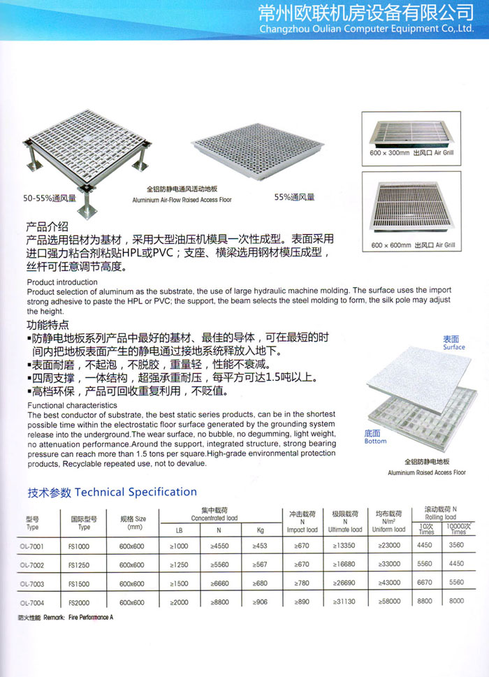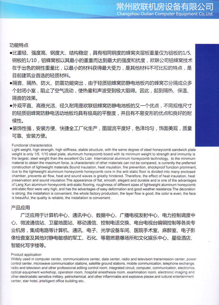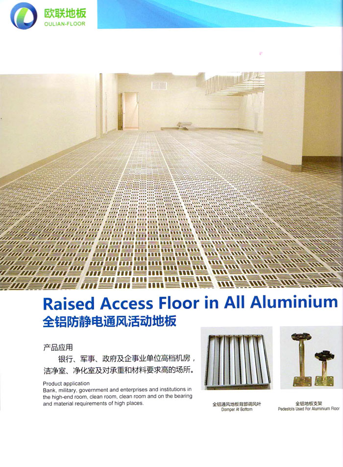 防靜電高架活動地板、全鋼地板、陶瓷地板是計算機行業(yè)發(fā)展起來的新型鋪地材料,隔離了潮氣、靜電灰塵,最重要的是解決了綜合布線問題,無需預埋管線,可隨時拆卸、搬移,保證了資訊設備完整的優(yōu)點,適應了智能化樓宇中信息自動化技術(shù)對所處環(huán)境的特定要求,避免了廣大客戶的雙重投資,使現(xiàn)代化辦公程度更加高效,辦公場所更加舒適。 “歐聯(lián)”系列全鋼地板,符合國家安全要求,種類完備多樣,其中防靜電陶瓷地板、硫酸鈣地板等除具有普通瓷質(zhì)的裝飾和實用性外,其耐磨、防水、防火功能優(yōu)于其它同類產(chǎn)品,防靜電系列地板,能切合不同客戶的要求,其靈活的配置,深受客戶歡迎,不同材質(zhì)的地板結(jié)構(gòu)使設計師的設計空間比傳統(tǒng)的更加廣闊自由和善變。 公司大力發(fā)展國內(nèi)外銷售業(yè)務,多次中標國內(nèi)重點工程 ,例:哈爾濱醫(yī)科大學、山東大學、上海普通機場等。 公司將一如既往開發(fā)和制造一流的產(chǎn)品,愿與廣大有識之士合作發(fā)展,共創(chuàng)美好未來。
