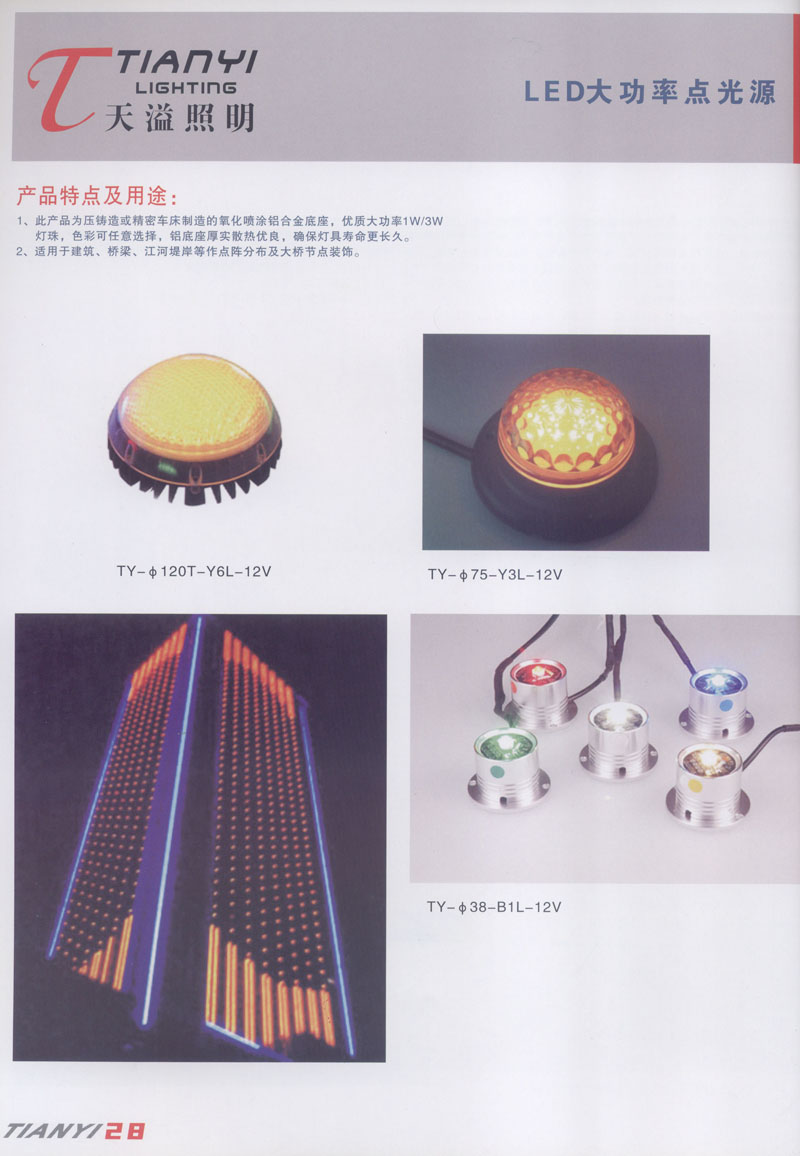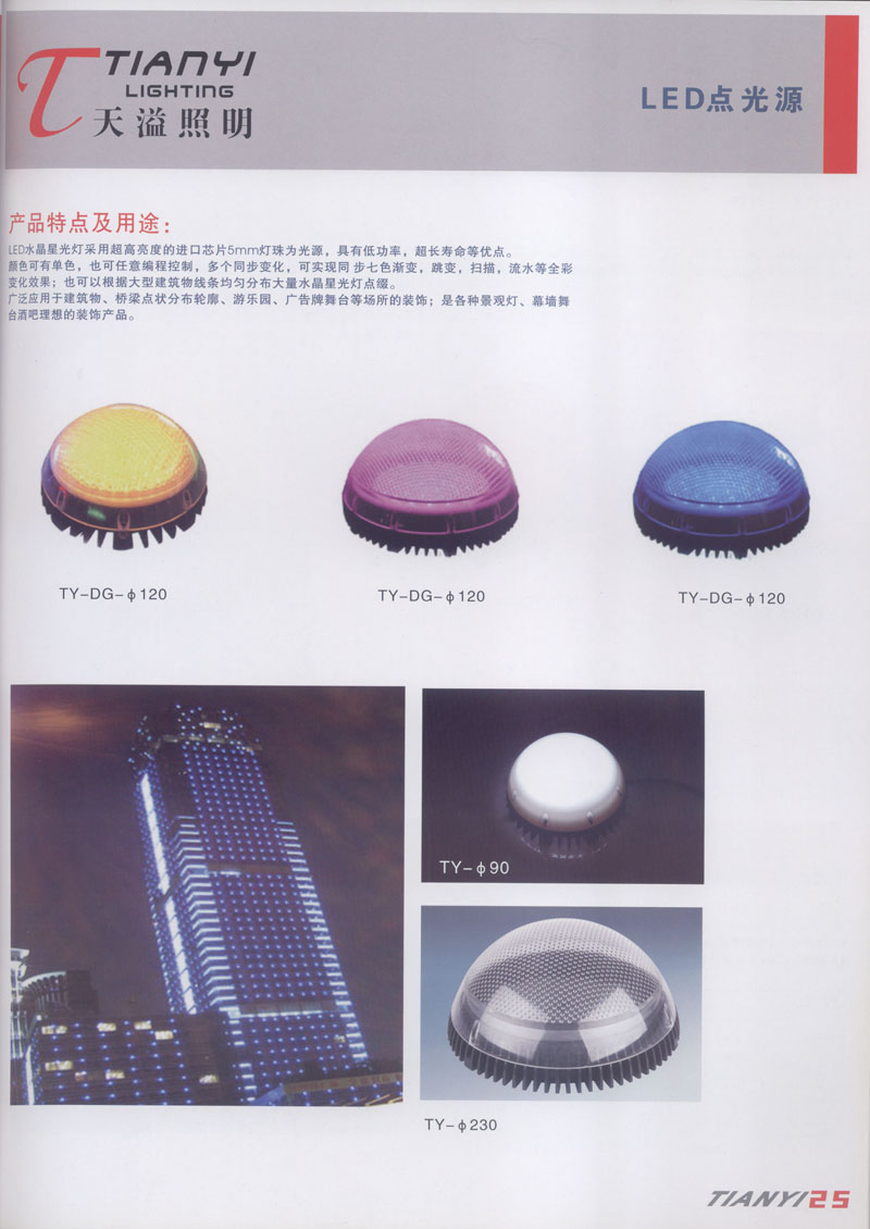 天溢照明是中國(guó)領(lǐng)先的專業(yè)從事LED廣告照明裝飾燈具設(shè)計(jì)、系統(tǒng)開(kāi)發(fā)、燈具制造、工程服務(wù)一體的專業(yè)型公司,本公司產(chǎn)品已廣泛應(yīng)用于全國(guó)大多數(shù)城市夜景亮化景觀照明、酒店休閑娛樂(lè)夜場(chǎng)夢(mèng)幻燈光、戶內(nèi)外廣告宣傳、建筑及室內(nèi)照明以及家居裝飾等場(chǎng)合。